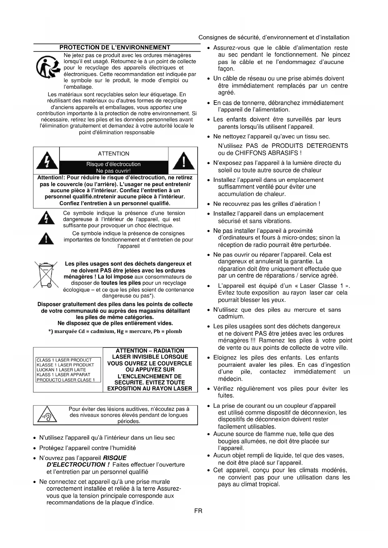 - L’appareil est équipé d’un « Laser Classe 1 ». Evitez toute exposition au rayon laser car cela pourrait blesser les yeux.