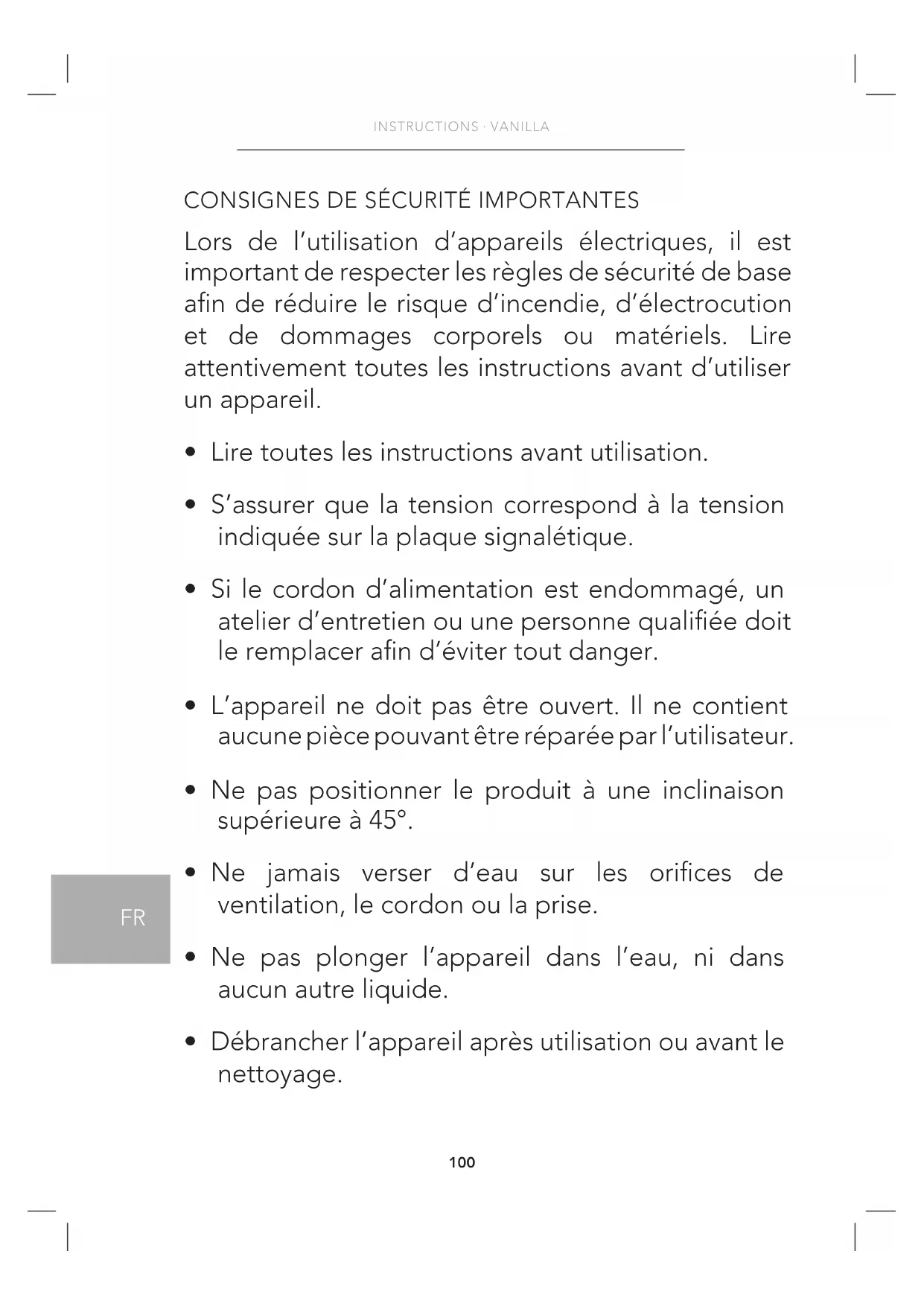 - Ne pas plonger l’appareil dans l’eau, ni dans aucun autre liquide.
