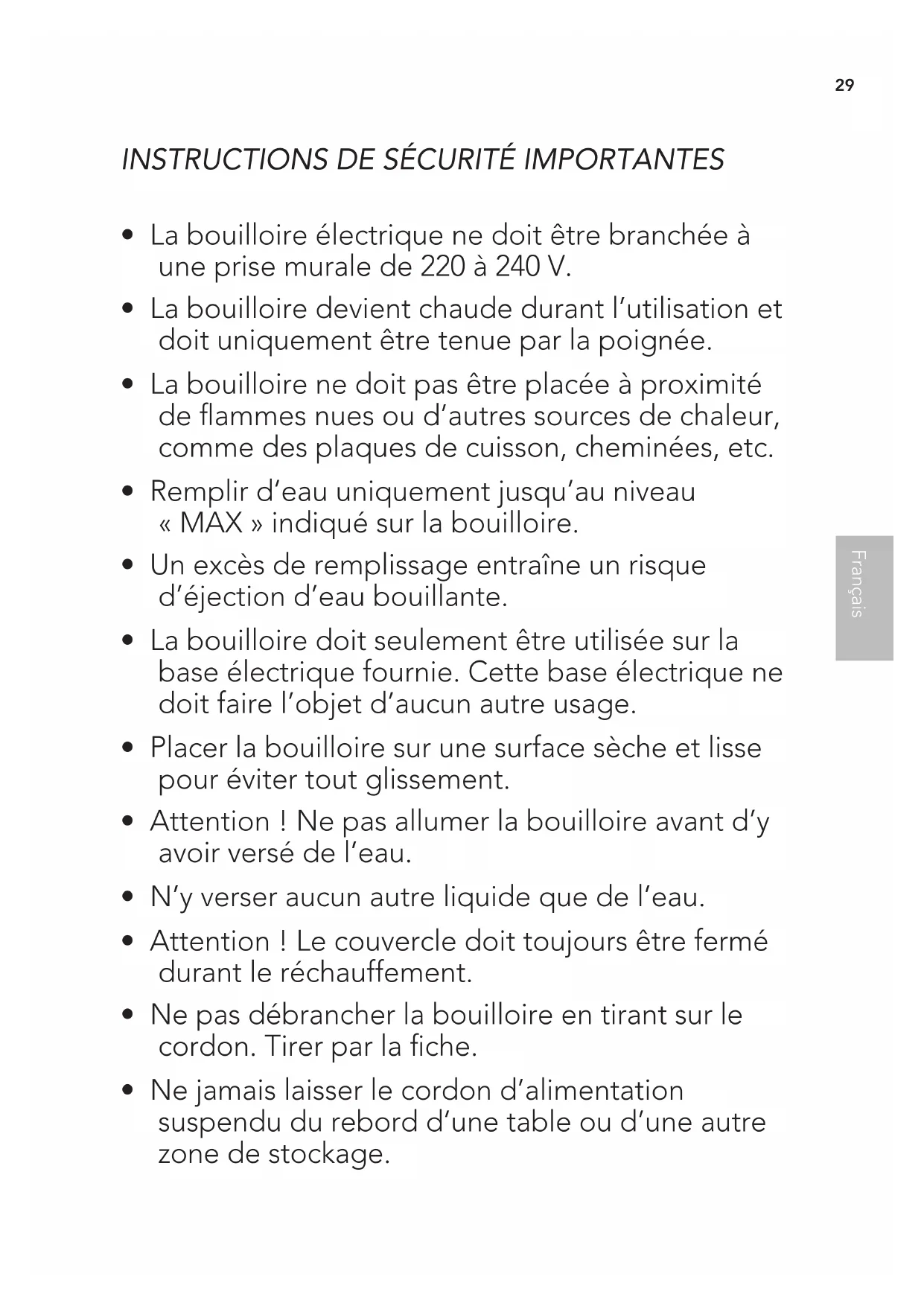- La bouilloire électrique ne doit être branchée à une prise murale de 220à240V.