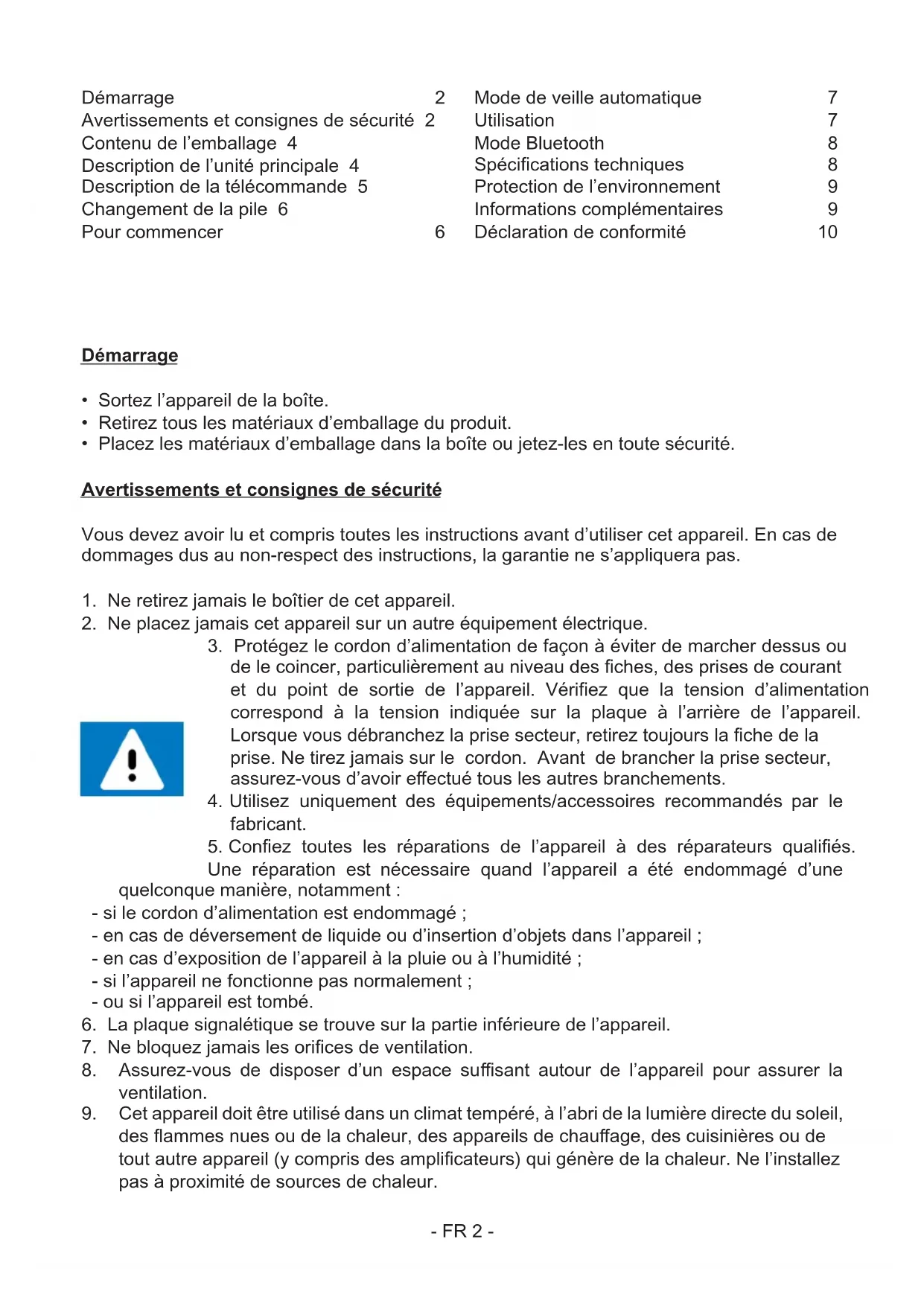 des ammes nues ou de la chaleur, des appareils de chauage, des cuisinières ou de tout autre appareil (y compris des amplicateurs) qui génère de la chaleur. Ne l’inallez pas à proximité de sources de chaleur. Démarrage 2 Avertissements et consignes de sécurité 2 Contenu de l’emballage 4 Description de l’unité principale 4 Description de la télécommande 5 Changement de la pile 6 Pour commencer 6 Mode de veille automatique 7 Utilisation 7 Mode Bluetooth 8 Spécications techniques 8 Protection de l’environnement 9 Informations complémentaires 9 Déclaration de conformité 10- FR 3 -