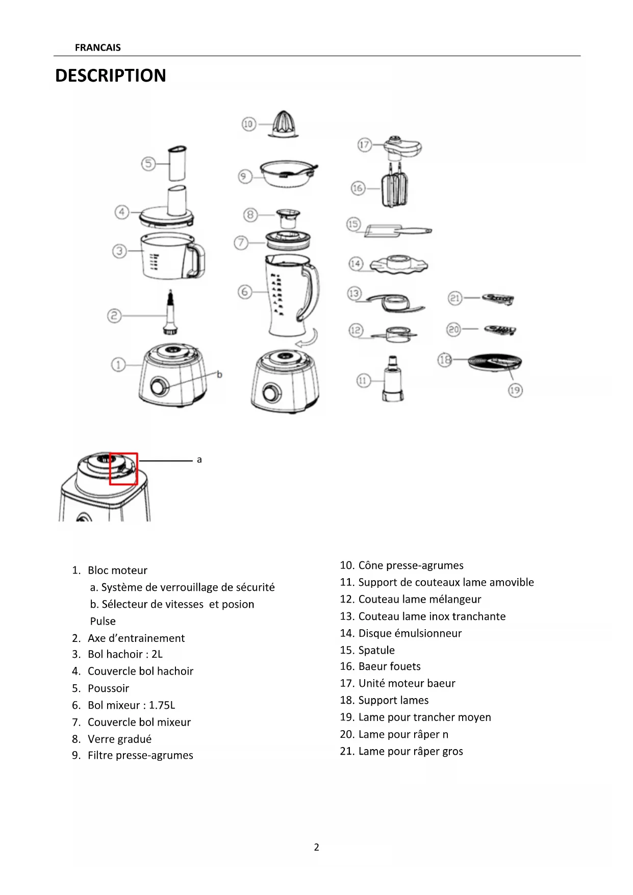 Enlevez bien tous les éléments de l'emballage, et ne laissez pas les éléments tels que les sacs plastiques, du polystyrène ou des élastiques à portée des enfants. Ces éléments pourraient être dangereux pour eux. Jeter en respectant les consignes de tri des déchets : √ L'appareil doit être utilisé et reposé sur une surface plane, stable, et sèche. √ Lavez tous les accessoires avec une éponge imbibée de produits liquides puis rincez-les à l'eau chaude avant de les sécher avec un torchon propre. Sélecteur de vitesse :