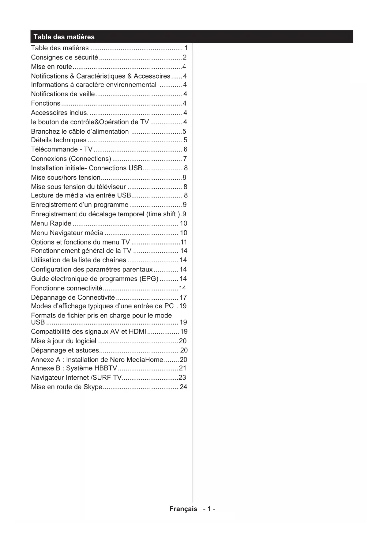 - Mise en route de Skype Français - 2 - Consignes de sécurité Le fait de faire fonctionner votre téléviseur TV dans des conditions ambiantes extrêmes peut l’endommager. AVERTISSEMENT RISQUE D’ELECTROCUTIONNE PAS OUVRIRATTENTION: POUR EVITER TOUT RISQUE D’ELECTROCUTION, NE RETIREZ PAS LE COUVERCLE.L’ENTRETIEN DES PIÈCES INTERNES EST INTERDIT AUX UTILISATEURS. VEUILLEZ CONFIER L’ENTRETIEN A UN PERSONNEL QUALIFIE. Remarque: Veuillez suivre les instructions qui s’afchent à l’écran en ce qui concerne l’activation des fonctionnalités connexes. Si une tempête ou des éclairs surviennent ou si votre TV ne sera pas utilisée pendant une longue période. (si par exemple vous partez en vacances) veuillez débrancher l’appareil de l’alimentation secteur. La prise d’alimentation est utilisée pour débrancher le téléviseur de l’alimentation secteur et doit donc rester facilement opérable. Le point d’exclamation à l’intérieur d’un triangle équilatéral a pour fonction d’alerter l’utilisateur de la présence d’instructions importantes pour le bon fonctionnement et l’entretien (maintenance) dans la documentation fournie avec l’appareil.Français - 3 - p. 24
