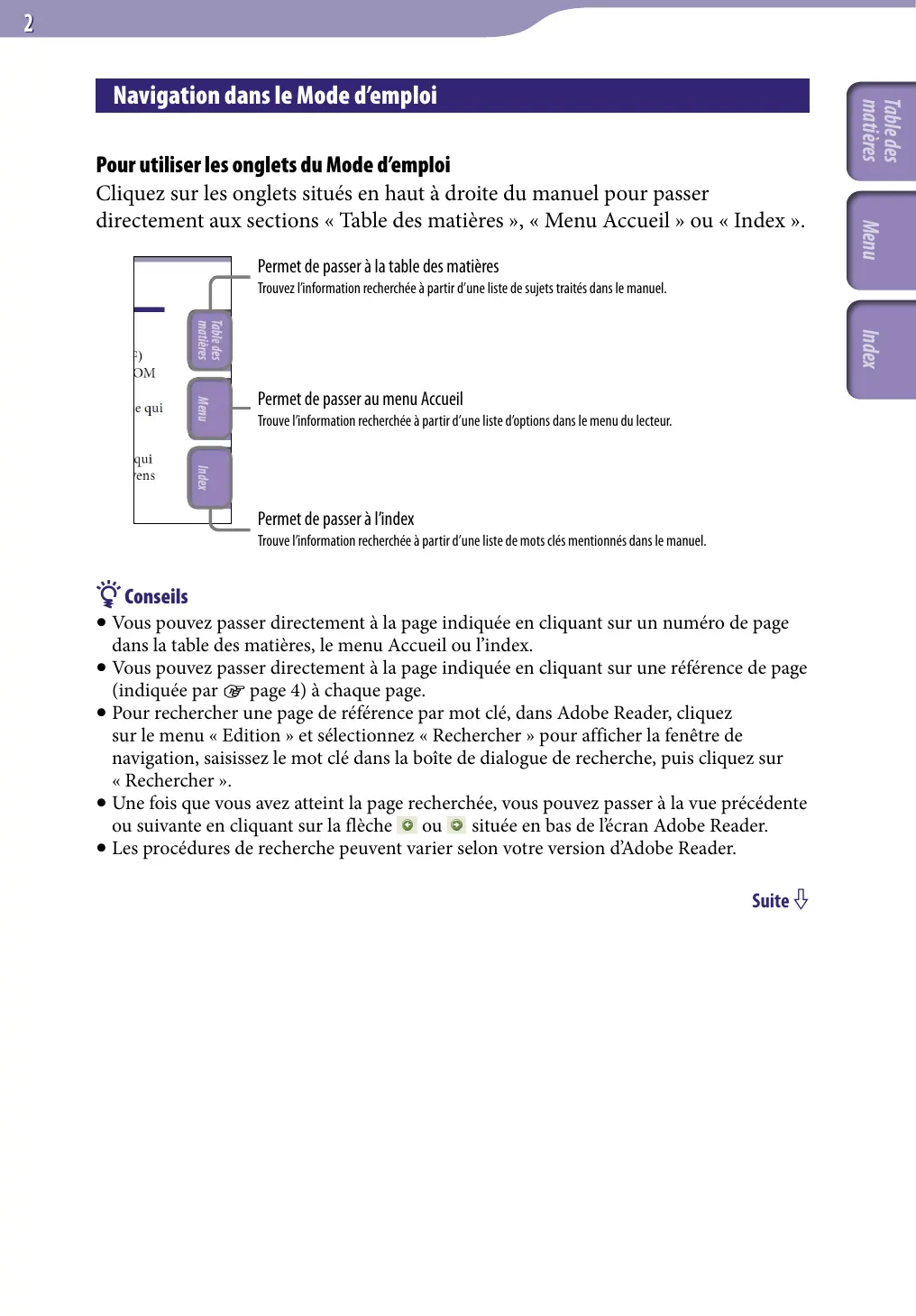 Permet de passer à la table des matières Menu Pour utiliser les onglets du Mode d’emploi Cliquez sur les onglets situés en haut à droite du manuel pour passer directement aux sections « Table des matières », « Menu Accueil » ou « Index ». Table des matières Navigation dans le Mode d’emploi Trouvez l’information recherchée à partir d’une liste de sujets traités dans le manuel. Index Permet de passer au menu Accueil Trouve l’information recherchée à partir d’une liste d’options dans le menu du lecteur. Permet de passer à l’index Trouve l’information recherchée à partir d’une liste de mots clés mentionnés dans le manuel. Conseils Vous pouvez passer directement à la page indiquée en cliquant sur un numéro de page dans la table des matières, le menu Accueil ou l’index. Vous pouvez passer directement à la page indiquée en cliquant sur une référence de page (indiquée par page 4) à chaque page. rechercher une page de référence par mot clé, dans Adobe Reader, cliquez Pour sur le menu « Edition » et sélectionnez « Rechercher » pour afficher la fenêtre de navigation, saisissez le mot clé dans la boîte de dialogue de recherche, puis cliquez sur « Rechercher ». fois que vous avez atteint la page recherchée, vous pouvez passer à la vue précédente Une ou suivante en cliquant sur la flèche située en bas de l’écran Adobe Reader. procédures recherche peuvent varier selon votre version d’Adobe Reader. Les