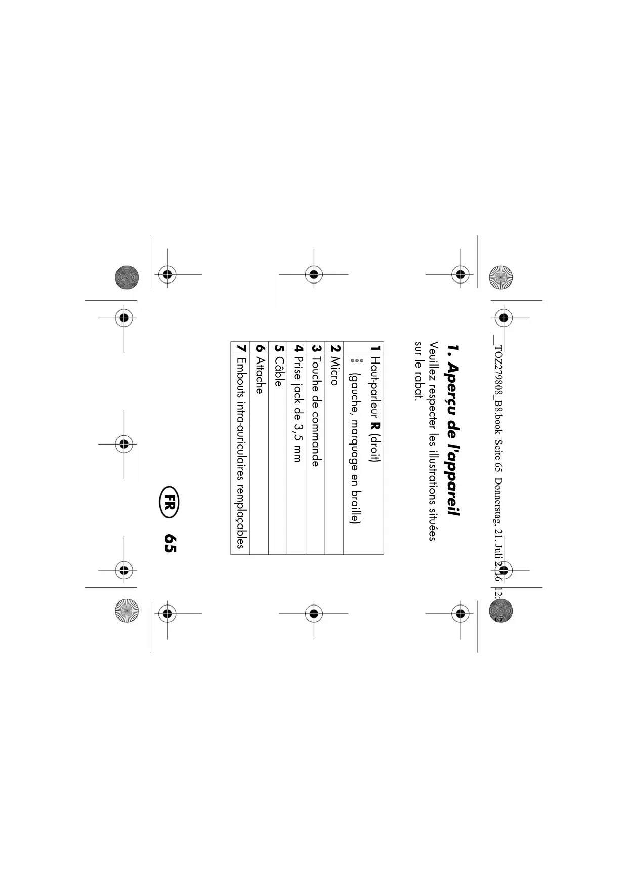 Veuillez respecter les illustrations situées sur le rabat. 1 Haut-parleur R (droit) (gauche, marquage en braille) 2 Micro 3 Touche de commande 4 Prise jack de 3,5 mm 5 Câble 6 Attache