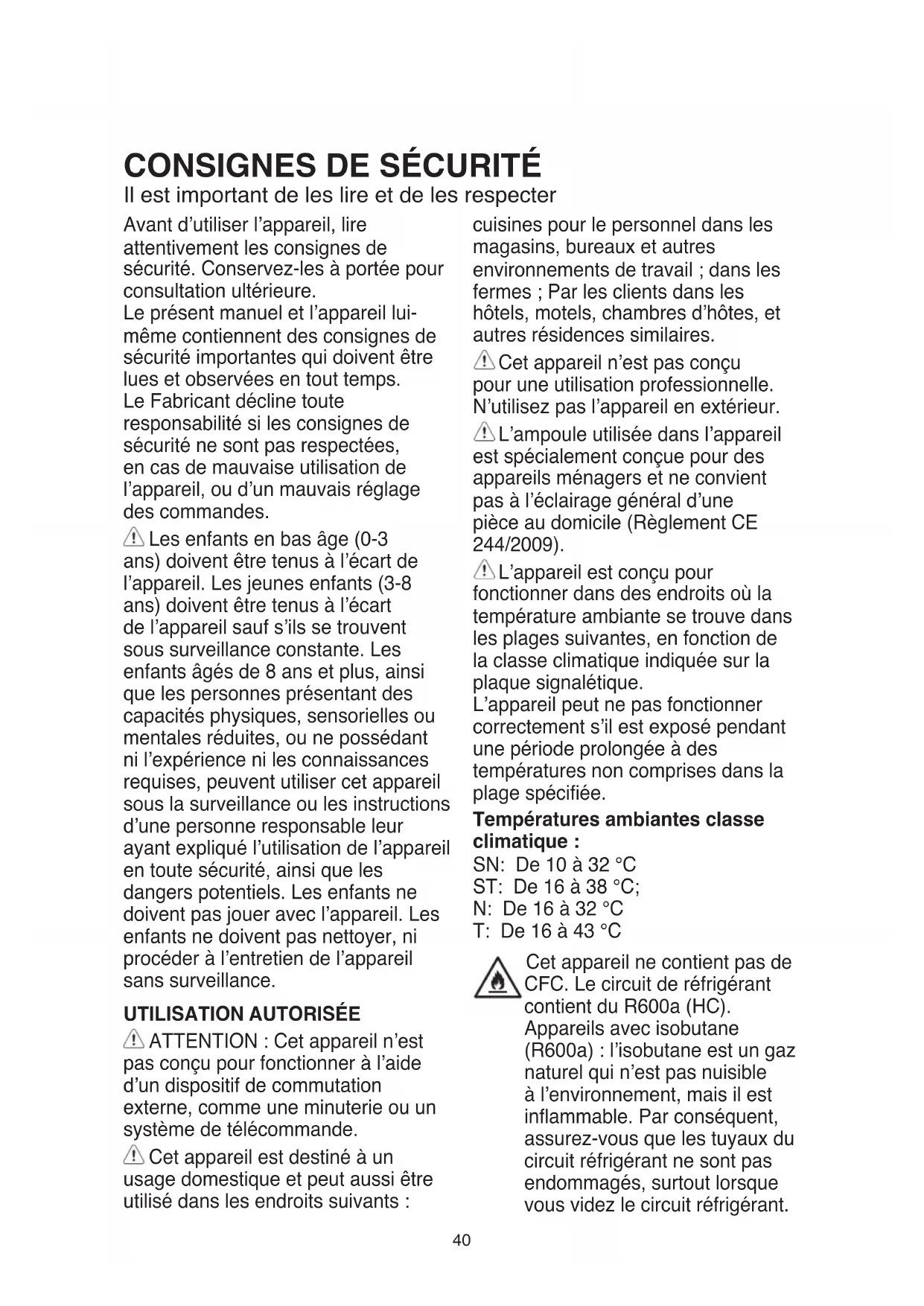 ATTENTION : Cet appareil n’est pas conçu pour fonctionner à l’aide d’un dispositif de commutation externe, comme une minuterie ou un système de télécommande. Cet appareil est destiné à un usage domestique et peut aussi être utilisé dans les endroits suivants : cuisines pour le personnel dans les magasins, bureaux et autres environnements de travail ; dans les fermes ; Par les clients dans les hôtels, motels, chambres d’hôtes, et autres résidences similaires. Cet appareil n’est pas conçu pour une utilisation professionnelle. N’utilisez pas l’appareil en extérieur. L’ampoule utilisée dans l’appareil est spécialement conçue pour des appareils ménagers et ne convient pas à l’éclairage général d’une pièce au domicile (Règlement CE 244/2009). L’appareil est conçu pour fonctionner dans des endroits où la température ambiante se trouve dans les plages suivantes, en fonction de la classe climatique indiquée sur la plaque signalétique. L’appareil peut ne pas fonctionner correctement s’il est exposé pendant une période prolongée à des températures non comprises dans la plage spéciée. Températures ambiantes classe climatique : SN: De 10 à 32 °C ST: De 16 à 38 °C; N: De 16 à 32 °C T: De 16 à 43 °C Cet appareil ne contient pas de CFC. Le circuit de réfrigérant contient du R600a (HC). Appareils avec isobutane (R600a) : l’isobutane est un gaz naturel qui n’est pas nuisible à l’environnement, mais il est inammable. Par conséquent, assurez-vous que les tuyaux du circuit réfrigérant ne sont pas endommagés, surtout lorsque vous videz le circuit réfrigérant.41