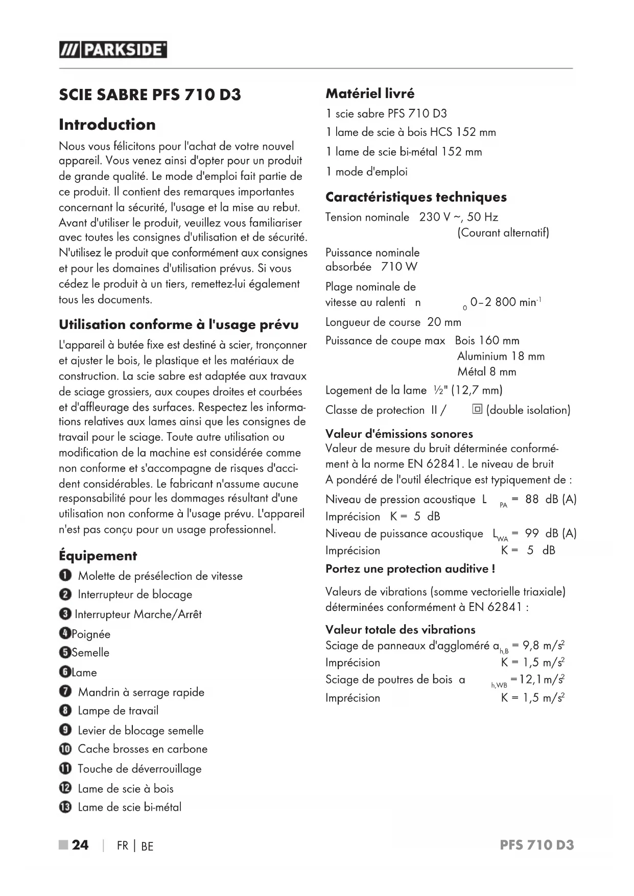 Introduction Nous vous félicitons pour l'achat de votre nouvel appareil. Vous venez ainsi d'opter pour un produit de grande qualité. Le mode d'emploi fait partie de ce produit. Il contient des remarques importantes concernant la sécurité, l'usage et la mise au rebut. Avant d'utiliser le produit, veuillez vous familiariser avec toutes les consignes d'utilisation et de sécurité. N'utilisez le produit que conformément aux consignes et pour les domaines d'utilisation prévus. Si vous cédez le produit à un tiers, remettez-lui également tous les documents. Utilisation conforme à l'usage prévu L'appareil à butée fixe est destiné à scier, tronçonner et ajuster le bois, le plastique et les matériaux de construction. La scie sabre est adaptée aux travaux de sciage grossiers, aux coupes droites et courbées et d'affleurage des surfaces. Respectez les informa- tions relatives aux lames ainsi que les consignes de travail pour le sciage. Toute autre utilisation ou modification de la machine est considérée comme non conforme et s'accompagne de risques d'acci- dent considérables. Le fabricant n'assume aucune responsabilité pour les dommages résultant d'une utilisation non conforme à l'usage prévu. L'appareil n'est pas conçu pour un usage professionnel. Équipement Molette de présélection de vitesse Interrupteur de blocage Interrupteur Marche/Arrêt Poignée Semelle Lame Mandrin à serrage rapide Lampe de travail Levier de blocage semelle Cache brosses en carbone Touche de déverrouillage Lame de scie à bois Lame de scie bi-métal Matériel livré 1 scie sabre PFS 710 D3 1 lame de scie à bois HCS 152 mm 1 lame de scie bi-métal 152 mm 1 mode d'emploi Caractéristiques techniques Tension nominale 230 V ∼, 50 Hz (Courant alternatif) Puissance nominale absorbée 710 W Plage nominale de vitesse au ralenti n