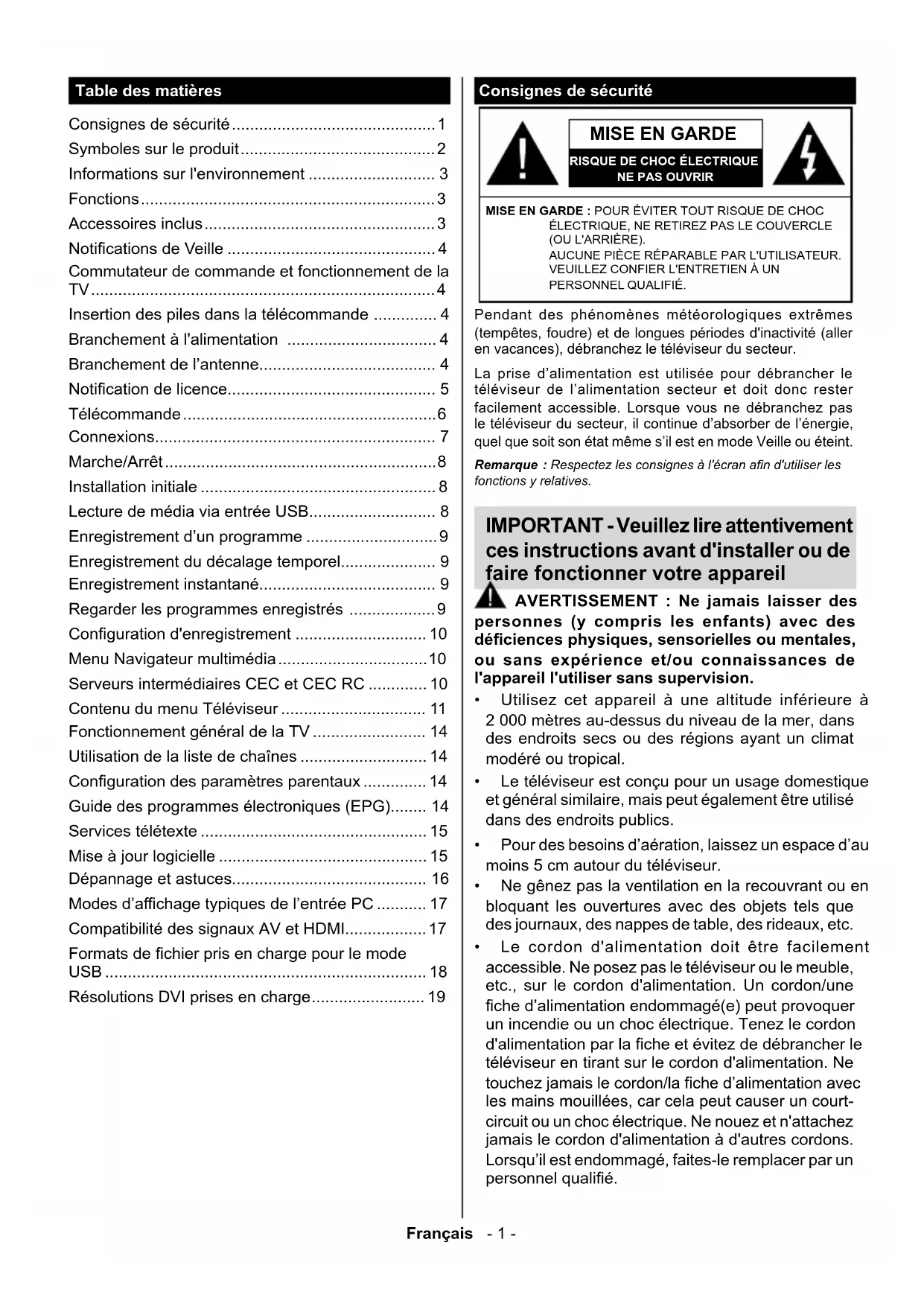 RISQUE DE CHOC ÉLECTRIQUENE PAS OUVRIRMISE EN GARDE : POUR ÉVITER TOUT RISQUE DE CHOC ÉLECTRIQUE, NE RETIREZ PAS LE COUVERCLE (OU L'ARRIÈRE). AUCUNE PIÈCE RÉPARABLE PAR L'UTILISATEUR. VEUILLEZ CONFIER L'ENTRETIEN À UN PERSONNEL QUALIFIÉ. Remarque : Respectez les consignes à l'écran an d'utiliser les fonctions y relatives. Pendant des phénomènes météorologiques extrêmes (tempêtes, foudre) et de longues périodes d'inactivité (aller en vacances), débranchez le téléviseur du secteur. La prise d’alimentation est utilisée pour débrancher le téléviseur de l’alimentation secteur et doit donc rester facilement accessible. Lorsque vous ne débranchez pas le téléviseur du secteur, il continue d’absorber de l’énergie, quel que soit son état même s’il est en mode Veille ou éteint. IMPORTANT - Veuillez lire attentivement ces instructions avant d'installer ou de faire fonctionner votre appareil