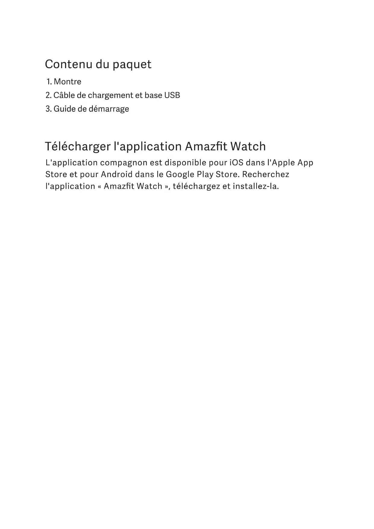Contenu du paquet Télécharger l'application Amazfit Watch L'application compagnon est disponible pour iOS dans l'Apple App Store et pour Android dans le Google Play Store. Recherchez l'application «Amazfit Watch», téléchargez et installez-la.Comment charger votre montre Toutes les montres Pace sont livrées avec une baerie chargée. Cependant, si votre montre ne s'allume pas, veuillez d'abord la charger. Insérez votre montre sur la base de chargement, comme montré ci-dessous. Assurez-vous d'aligner les 4 broches de chargement à l'arrière de la montre avec celles de la base de chargement. Connectez la base de chargement à une prise USB ou un ordinateur au moyen du câble USB fourni. Une fois que la montre est posée sur la base, «En charge» s'affiche sur l'écran.Allumer/éteindre Pour allumer votre montre, maintenez appuyé le bouton sur son côté droit. L'écran de votre montre s'éclaire et affiche une animation de démarrage. Celle-ci peut durer plusieurs minutes lors du premier démarrage. Un QR code s'affiche également sur votre montre la première fois. Ce code sert à apparier votre montre à votre appareil mobile. Pour ce faire, suivez les instructions de l'application. Pour éteindre votre montre, maintenez enfoncé le même bouton de droite. Touchez OK sur l'interface pour confirmer l'arrêt.Connecter la montre Activez le Bluetooth sur votre dispositif mobile. Assurez-vous que votre montre est chargée. Ouvrez l'application Amazfit Watch et suivez les instructions. Scannez le QR code affiché sur l'écran de votre montre pour l'apparier à votre appareil mobile. Suivez les instructions dans l'application, activez les Notifications dans les Paramètres Système.Activer le Wi-Fi Accédez à l'écran d'accueil en appuyant sur le bouton sur la droite de la montre. Depuis l'écran d'accueil, faites glisser vers le bas pour accéder aux Paramètres Système. Faites glisser vers la gauche jusqu'à aeindre Plus de paramètres. Touchez pour ouvrir. Faites glisser vers le bas jusqu'à trouver l'option Wi-Fi et connectez-vous à votre réseau. Naviguer dans votre montre Pour revenir à l'écran d'accueil, appuyez sur le bouton sur la droite de la montre. Depuis l'écran d'accueil, faites glisser vers le haut pour afficher les notifications des SMS, e-mails et applications arrivées sur votre téléphone. Faites glisser vers le bas pour accéder aux Paramètres système: Météo, Durée de vie de la baerie, Mode silencieux, et Plus de paramètres. Depuis le menu Plus de paramètres, vous pouvez accéder à: Trouver mon téléphone, Bluetooth, Wi-Fi, Temps en silencieux, Rétroéclairage, Toucher pour sortir de veille, Vibrations, Habitudes de port, Mise à jour, Réinitialisation paramètres d'usine, et Arrêt. Faites glisser à gauche et à droite pour accéder aux différents widgets, incluant, sans s'y limiter: Sports, Course, Activités quotidiennes, Musique, Alarme, Météo, Boussole, Chronomètre, Sommeil, Fréquence cardiaque.Mere à jour avec le firmware le plus récent Assurez-vous d'être connecté au Wi-Fi. Depuis l'écran d'accueil de la montre, faites glisser vers le bas pour accéder aux Paramètres Système: Météo, Durée de vie de la baerie, Mode silencieux, et Plus de paramètres. Faites glisser vers la gauche jusqu'à aeindre Plus de paramètres. Touchez pour ouvrir. Faites glisser vers le haut jusqu'à trouver Mere à jour. Touchez pour vérifier les mises à jour disponibles et téléchargez la version la plus récente. Précautions à suivre avec la baerie intégrée Ne tentez pas de remplacer la baerie de l'appareil par vous-même ou de forcer l'extraction de la baerie intégrée. Utilisez uniquement la base de chargement officielle pour charger votre appareil.Certifications et homologations de sécurité Tous les produits Amazfit sont certifiés FCC et CE et répondent aux exigences nécessaires pour leur vente aux États-Unis et en Europe. Informations sur la mise au rebut et le recyclage Ce symbole signifie que ce produit doit être mis au rebut séparément des déchets ménagers ordinaires à la fin de son cycle de vie. Soyez aentif au fait qu'il est de votre responsabilité de mere les équipements électroniques au rebut dans les centres de recyclage pour aider à conserver les ressources naturelles.Consignes de sécurité La montre est étanche à l'eau et à la poussière et est certifiée IP67. Elle est complètement étanche à la poussière (6) et supporte l'immersion dans 1 mètre d'eau statique à une température normale pendant 30minutes (7). Elle ne supporte pas les bains et la natation. Veuillez ne pas utiliser la montre sous l'eau. Si elle a été immergée, séchez-la avec un chiffon doux avant de l'utiliser ou de la charger. La montre n'est pas étanche à l'eau de mer, aux agents chimiques, aux solutions acides et basiques, etc. Les défauts entraînés par les dommages causés par des liquides ne sont pas couverts par la garantie. Ne tentez pas de forcer l'ouverture de la montre. Les substances chimiques contenues dans ce produit et/ou sa baerie sont susceptibles d'endommager l'environnement et/ou la santé humaine s'ils sont manipulés ou mis au rebut de façon incorrecte. Ne tentez pas de démonter votre appareil. N'exposez pas votre appareil à des températures très élevées ou très basses. N'exposez pas votre appareil à la lumière directe du soleil pendant des périodes prolongées. N'utilisez pas votre appareil dans un sauna ou un hammam.Spécifications techniques Nom du produit: AMAZFIT PACE Numéro de modèle: A1612 Capacité de la baerie: 280mAh Connexion sans fil: Bluetooth 4.0 / Wi-Fi Courant d'entrée: 500mA (max) Plage de températures de fonctionnement: 0°C - 40°C (32°F - 104°F) Norme d'étanchéité à l'eau et à la poussière: IP67 Exigences de l'appareil: iPhone® 4S ou version ultérieure doté d'iOS® 8.0 ou version ultérieure, Android