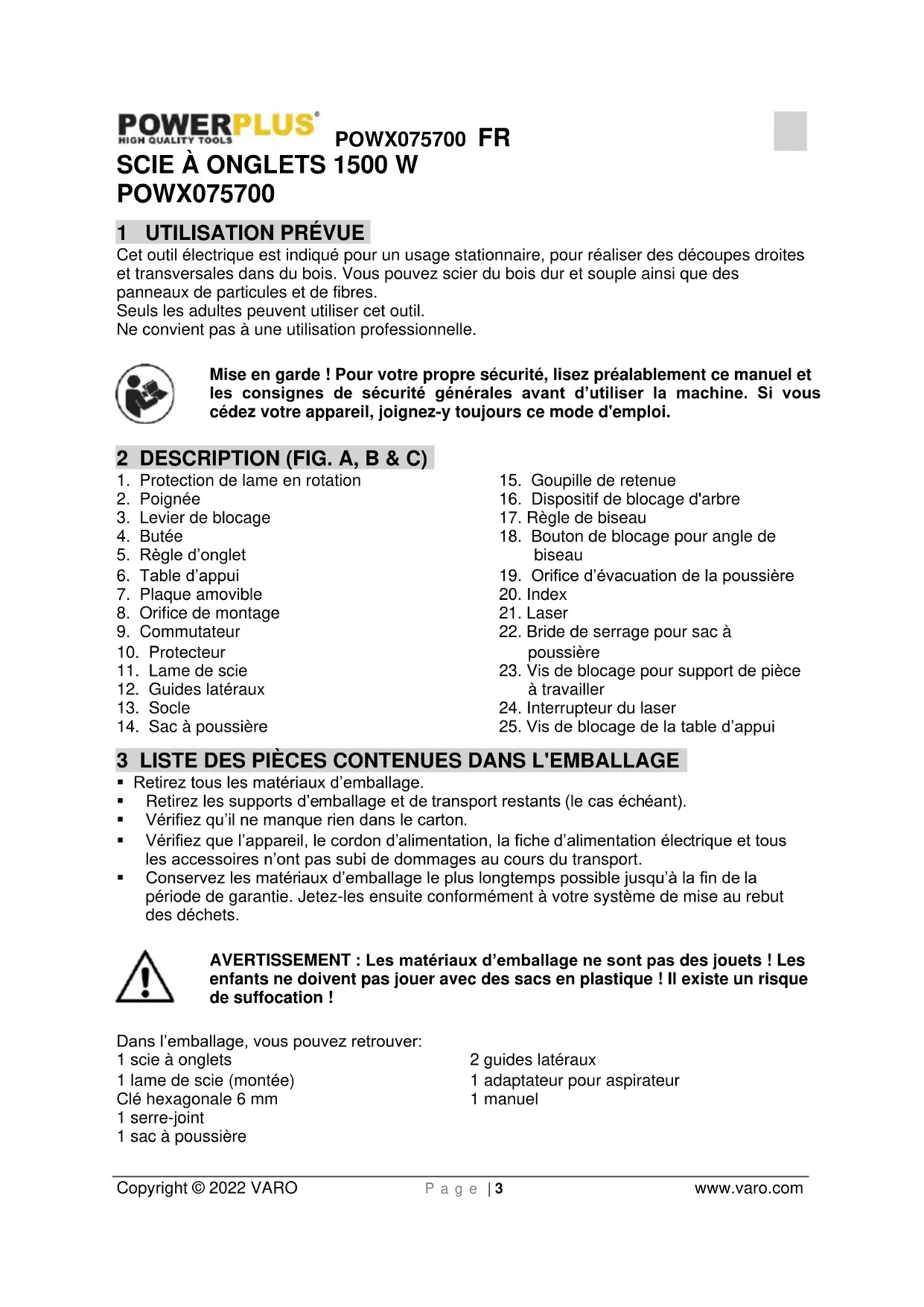 - Les lunettes permettant de voir le faisceau laser ne protègent pas contre le rayonnement laser.POWX075700 FR Copyright © 2022 VARO P a g e | 8 www.varo.com 8 MONTAGE Retirer la fiche de prise de courant avant d'effectuer tout réglage ou entretien. N’utilisez pas cette scie à onglets tant qu’elle n’a pas été complètement assemblée et bien préparée à une utilisation conforme au présent manuel.