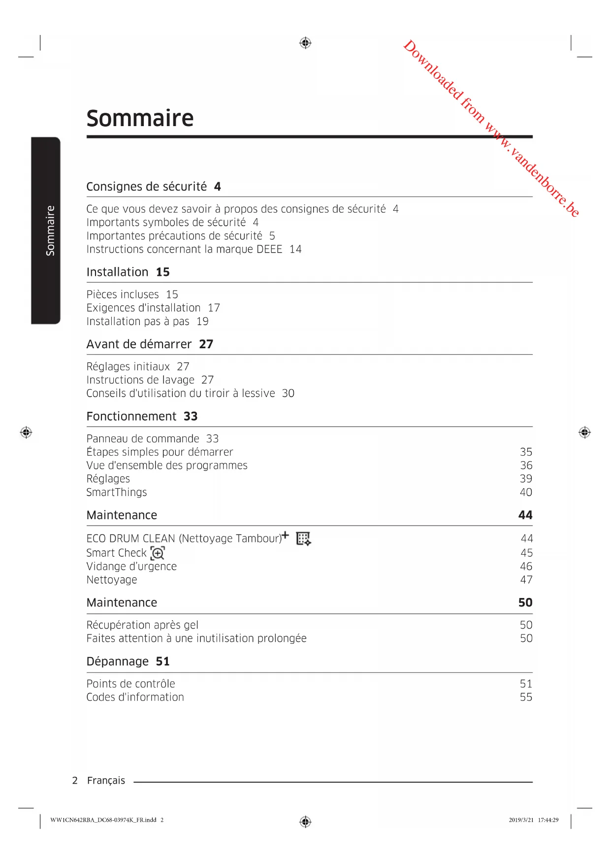 www.samsung.com/be/support (Dutch) www.samsung.com/be_fr/support (French) DC68-03974K-00 WW1CN642RBA_DC68-03974K_NL.indd 64 2019/3/21 17:42:16 Downloaded from www.vandenborre.beLave-linge Manuel d'utilisation WW1*N6***** WW1CN642RBA_DC68-03974K_FR.indd 1 2019/3/21 17:44:28 Downloaded from www.vandenborre.be2 Français Sommaire Sommaire Consignes de sécurité 4 Ce que vous devez savoir à propos des consignes de sécurité 4 Importants symboles de sécurité 4 Importantes précautions de sécurité 5 Instructions concernant la marque DEEE 14 Installation 15 Pièces incluses 15 Exigences d'installation 17 Installation pas à pas 19 Avant de démarrer 27 Réglages initiaux 27 Instructions de lavage 27 Conseils d'utilisation du tiroir à lessive 30 Fonctionnement 33 Panneau de commande 33 Étapes simples pour démarrer 35 Vue d'ensemble des programmes 36 Réglages 39 SmartThings 40 Maintenance 44 ECO DRUM CLEAN (Nettoyage Tambour) 44 Smart Check
