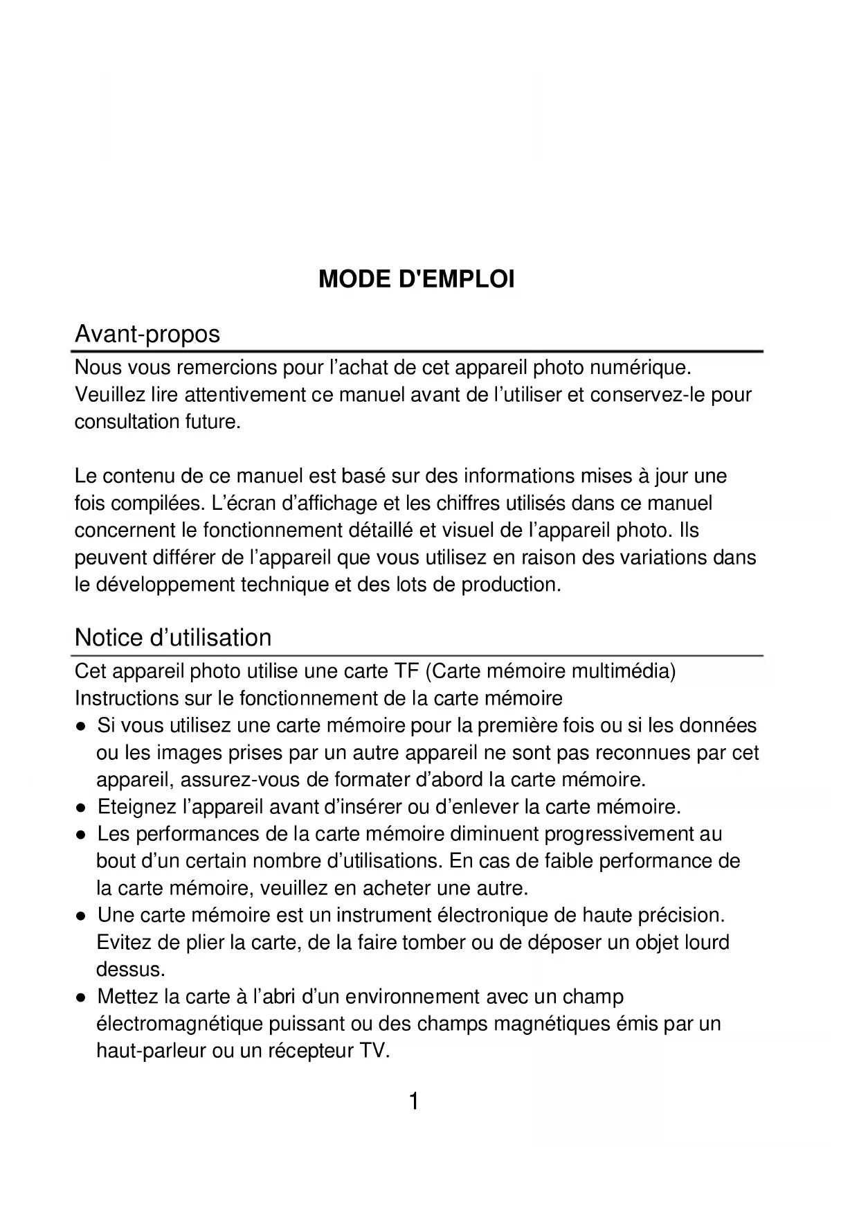 MODE D'EMPLOI Avant-propos Nous vous remercions pour l’achat de cet appareil photo numérique. Veuillez lire attentivement ce manuel avant de l’utiliser et conservez-le pour consultation future. Le contenu de ce manuel est basé sur des informations mises à jour une fois compilées. L’écran d’affichage et les chiffres utilisés dans ce manuel concernent le fonctionnement détaillé et visuel de l’appareil photo. Ils peuvent différer de l’appareil que vous utilisez en raison des variations dans le développement technique et des lots de production. Notice d’utilisation Cet appareil photo utilise une carte TF (Carte mémoire multimédia) Instructions sur le fonctionnement de la carte mémoire ● Si vous utilisez une carte mémoire pour la première fois ou si les données ou les images prises par un autre appareil ne sont pas reconnues par cet appareil, assurez-vous de formater d’abord la carte mémoire. ● Eteignez l’appareil avant d’insérer ou d’enlever la carte mémoire. ● Les performances de la carte mémoire diminuent progressivement au bout d’un certain nombre d’utilisations. En cas de faible performance de la carte mémoire, veuillez en acheter une autre. ● Une carte mémoire est un instrument électronique de haute précision. Evitez de plier la carte, de la faire tomber ou de déposer un objet lourd dessus. ● Mettez la carte à l’abri d’un environnement avec un champ électromagnétique puissant ou des champs magnétiques émis par un haut-parleur ou un récepteur TV.2 ● Mettez la carte mémoire à l’abri d’un environnement aux températures extrêmement élevées ou basses. ● Vérifiez la propreté de la carte et assurez-vous qu’aucun liquide n’entre en contact avec elle. En cas de contact avec un liquide, nettoyez et essuyez la carte avec un chiffon doux. ● En cas de non-utilisation, conservez la carte mémoire dans un lieu sûr. ● Il est normal que la carte mémoire devienne chaude après une utilisation prolongée. ● N’utilisez pas une carte mémoire ayant été utilisée dans un autre appareil d’enregistrement vidéo ou appareil photo numérique. Au cas contraire, formatez-la d’abord. ● Nous vous recommandons de ne pas utiliser une carte mémoire ayant été formatée par un autre caméscope ou appareil photo numérique. ● Les données recodées risquent d’être perdues dans un des cas suivants : - Utilisation inappropriée de la carte mémoire. - Mise hors tension de l’appareil ou retrait de la carte mémoire au cours de l’enregistrement, la suppression (formatage) ou la lecture. ● Il est recommandé de faire une sauvegarde des données importantes sur un autre média tel qu’un disque dur ou un CD. ● Pour garantir une bonne qualité de l’image, il est nécessaire d’utiliser une carte de classe 4 au minimum avec la carte TF. Entretien de l’appareil photo ● Utilisez un cache d’objectif adéquat pour éviter d’abîmer les surfaces de l’objectif et de l’écran. ● Enlevez d’abord la poussière ou le sable se trouvant sur la surface de l’objectif en envoyant de l’air dessus. Nettoyez-le ensuite délicatement à l’aide d’un chiffon ou d’un mouchoir en papier adapté au nettoyage des instruments optiques. Si nécessaire, utilisez un produit de nettoyage pour objectif. L’utilisation d’un produit organique pour nettoyer l’appareil photo est strictement interdite. ● Ne touchez pas la surface de l’objectif avec vos doigts.3 Exigences du système Lors de l’utilisation et du fonctionnement de cet appareil, veuillez porter une attention particulière aux exigences minimales du système. Il est fortement recommandé d’utiliser un ordinateur performant pour un meilleur contrôle de l’appareil et obtenir de meilleurs effets. Les exigences minimales du système sont les suivantes : Exigences du système Système d’exploitation Microsoft Windows 7, 2000, XP, VISTA CPU Supérieur à Intel PIII667 ou CPU équivalent Mémoire interne 512 Mo ou supérieur Carte son et carte graphique Carte son et carte graphique compatibles avec DirectX8 ou supérieur CD-ROM Vitesse 4X ou supérieure Disque dur Espace libre de 1 Go minimum Autres Une interface standard USB 1.1 ou USB 2.0