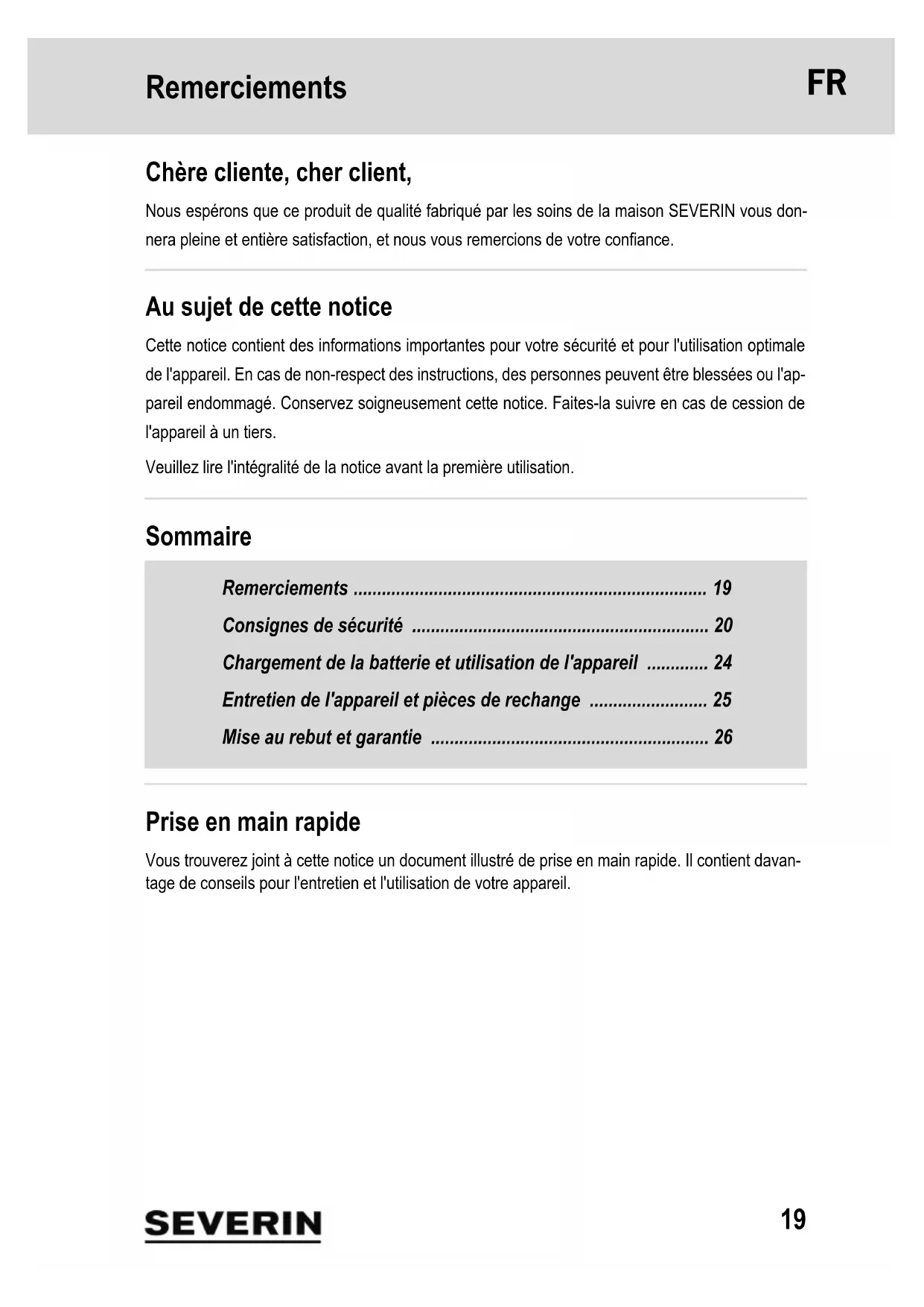 - Disposing of the appliance and rechargeable battery Appliances and rechargeable batteries that are marked with this symbol must be disposed of separately from household garbage. Appliances and rechargeable bat- teries contain valuable raw materials that can be recycled. Proper disposal protects the environment and the health of your fellow men. Dispose of the appliance and the rechargeable battery removed that was removed separately at the appropriate col- lection points. Warranty The legal warranty rights with respect to the seller and any seller warranties are unaffected by the following warranty conditions. If repair should be necessary, contact our customer service department via telephone or mail. The contact information can be found in the appendix to this instruction manual. In case of warranty claim, you can also contact the dealer directly. In addition, SEVERIN grants a manufac- turer's warranty of two years from the date of purchase. During this period, we will eliminate all de- fects due to material or production faults that compromise the function. Other claims are excluded. Excepted from the warranty are: Damage that is due to non-observance of the instruction manual, improper handling or normal wear; also easily-breakable parts such as glass, plastic or LEDs. Bat- teries and rechargeable batteries, that have become defective or whose run-time has shortened as a result of normal wear or improper handling, are also not covered by the warranty. If the appliance is tampered with by persons not authorised by SEVERIN, this will render the war- ranty null and void.19 Remerciements 1 Remerciements Chère cliente, cher client, Nous espérons que ce produit de qualité fabriqué par les soins de la maison SEVERIN vous don- nera pleine et entière satisfaction, et nous vous remercions de votre confiance. Au sujet de cette notice Cette notice contient des informations importantes pour votre sécurité et pour l'utilisation optimale de l'appareil. En cas de non-respect des instructions, des personnes peuvent être blessées ou l'ap- pareil endommagé. Conservez soigneusement cette notice. Faites-la suivre en cas de cession de l'appareil à un tiers. Veuillez lire l'intégralité de la notice avant la première utilisation. Sommaire Remerciements p. 19