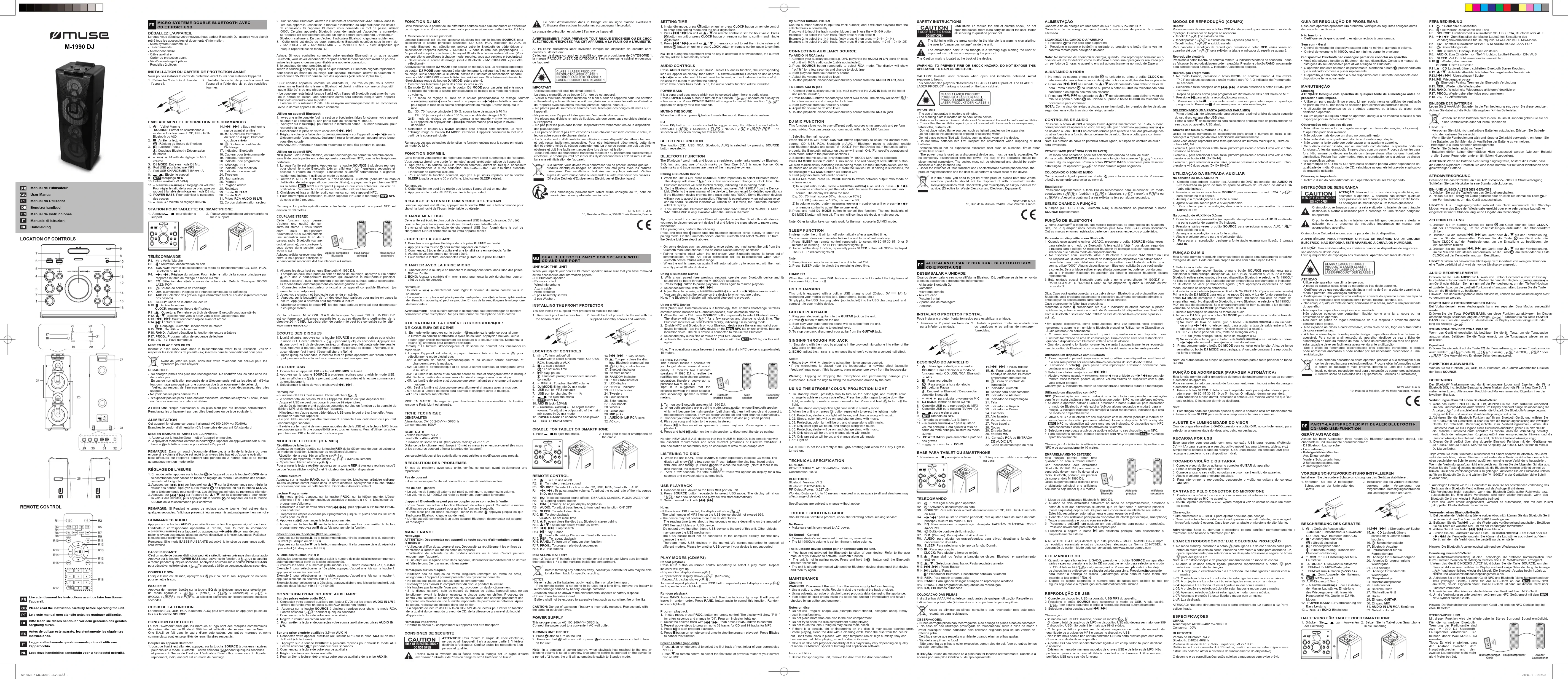 de cette unité à nouveau.Remarque: La portée opérationnelle entre l'unité principale et un appareil NFC est environ de 10 mètres.COUPLAGE STÉRÉOCette fonction vous permet d'obtenir une qualité de son surround stéréo. Il vous faudra alors deux haut-parleurs Bluetooth M-1990 DJ an obtenir une séparation sans l en deux canaux radio Bluetooth (canaux droit et gauche), par conséquent, vous devez donc acheter deux M-1990 DJ.Astuces: la distance recommandée entre le haut-parleur principale et le haut-parleur secondaire doit être inférieure à 4 mètres.You can install the supplied front protector to stabilize the unit.Pode instalar o protetor frontal fornecido para estabilizar a unidade.Installieren Sie die vordere Schutzvorrichtung, um das Gerät zu stabilisieren.Vous pouvez installer le carter de protection avant fourni pour stabiliser l'appareil.1. Remove 2 pcs xed screws from the bottom of unit.1. Remova os 2 parafusos xos da parte inferior da unidade.1. Retirez les 2 vis xés du bas de l'appareil. 2. Install the front protector to the unit with the supplied assembly screws and washers.2. Instale o protetor frontal na unidade com os parafusos e as anilhas de montagem fornecidas.2. Installieren Sie die vordere Schutzab-deckung unter Verwendung der mitgelieferten Befestigungsschrauben und Unterlegscheiben am Gerät.2. Installez le carter de protection avant sur l'appareil à l'aide des vis et des rondelles fournies.1. Push to eject the cradle.1. Pressione para ejetar a base.1. Drücken Sie zum Auswerfen der Halterung.1. Appuyez pour éjecter le support.R1. : To turn unit on/o R2. : To mute or restore soundR3. SOURCE: To select function mode: CD, USB, RCA, Bluetooth or AUX R4. / : To adjust master volume; To adjust the output ratio of the mix source in DJ mix mode R5. EQ: To select desired sound eects: DEFAULT/ CLASSIC/ ROCK/ JAZZ/ POP R6. Lighting control buttonR7. DIM. (Dimmer): To adjust display brightnessR8. AUDIO: To adjust bass/ treble; to turn loudness function ON/ OFFR9. SLEEP: To select sleep timeR10. : To stop playback CLOCK: To set clock timeR11. : To open/ close the disc tray; Bluetooth stereo pairingR12. / : Select up/ down; Folder up/ downR13. / : Skip/ searchR14. : Play/ Pause : Bluetooth pairing/ Disconnect Bluetooth connectionR15. REP.: To repeat playbackR16. RAND.: To turn on/ o random play functionR17. PROG.: To program playback sequencesR18. 0-9, +10 buttonsR1. : Para ligar e desligar o aparelho R2. : Activação/ desactivação do som R3. SOURCE: Para selecionar o modo de funcionamento: CD, USB, RCA, Bluetooth ou AUX R4. / : para ajustar o volume principal; Para ajustar a taxa de saída da fonte principal/ mistura no modo DJ mix R5. EQ: Para selecionar a equalização desejada: PADRÃO/ CLÁSSICA/ ROCK/ JAZZ/ POPR6. Botão de controle de iluminaçãoR7. DIM. (Dimmer): Para ajustar o brilho do ecrã R8. AUDIO: para ajustar os graves/agudos; para ativar/ desativar a função de cancelamento do ruídoR9. SLEEP: Para selecionar o tempo da função Dormir.R10. : Parar reprodução CLOCK: Para ajustar a hora do relógio R11. : Parar abrir ou fechar a bandeja de discos; Bluetooth emparelhamento estéreoR12. / : Selecionar cima/ baixo; Pasta seguinte / anteriorR13. , : Pular/ BuscarR14. : Leitura/ Pausa : Emparelhar Bluetooth/ Desconectar conexão BluetoothR15. REP.: Para repetir a reproduçãoR16. RAND.: Para ligar ou desligar a função de reprodução aleatóriaR17. PROG.: Para programar as sequências de reproduçãoR18. 0-9, +10 Botões numéricosR1. : Gerät ein-/ ausschalten R2. : Aktivieren/ Deaktivieren des Tons R3. SOURCE: Funktionsmodus auswählen: CD, USB, RCA, Bluetooth oder AUX. R4. / : Zum Einstellen der Master-Lautstärke; Einstellung des Wiedergabeverhältnisses für Hauptquelle/ Mix-Quelle im DJ Mix-ModusR5. EQ: Toneekt auswählen: DEFAULT/ KLASSIK/ ROCK/ JAZZ/ POPR6. BeleuchtungstasteR7. DIM. (Dimmer): Display-Helligkeit einstellenR8. AUDIO: Zum Einstellen von Tief-/ Hochton; Lautheit-Funktion EIN/ AUSR9. SLEEP: Zeit für Schlummerfunktion auswählen.R10. : Wiedergabe beenden CLOCK: Uhrzeit einstellenR11. : CD-Laufwerk önen/ schließen; Bluetooth Stereo-Kopplung R12. / : Aufwärts/ Abwärts; Nächstes/ Vorhergehendes Verzeichnis R13. / : Überspringen / SucheR14. : Wiedergabe/ pause : Bluetooth-Pairing/ Trennen der Bluetooth-VerbindungR15. REP.: Wiederholte WiedergabeR16. RAND.: Wiederholte Wiedergabe aktivieren/ deaktivierenR17. PROG.: Wiedergabereihenfolge programmierenR18. 0-9, +10 ZierntastenR1. : Veille/ Marche R2. : Activation/ désactivation du son R3. SOURCE: Permet de sélectionner le mode de fonctionnement: CD, USB, RCA, Bluetooth ou AUX R4. / : Réglage du volume; Pour régler le ratio de la source principale par rapport à la table de mixage en mode DJ mix R5. EQ: Sélection des eets sonores de votre choix: Défaut/ Classique/ ROCK/ JAZZ/ POPR6. Bouton de contrôle de l'éclairageR7. DIM. (Luminosité): Réglage de l’intensité lumineuse de l'achage R8. AUDIO: Sélection des graves/ aigus et marche/ arrêt du Loudness (renforcement des basses)R9. SLEEP: Choix de la durée de lectureR10. : Arrêter la lecture CLOCK: réglage de l'heure de l'horlogeR11. : Ouverture/ Fermeture du tiroir de disque; Bluetooth couplage stéréo R12. / : Sélectionner vers le haut/ vers le bas; Dossier haut/ bas R13. , : Saut/ recherche rapide avant et arrière R14. : Lecture/ Pause : Couplage Bluetooth/ Déconnexion BluetoothR15. REP.: Répétition de la lectureR16. RAND.: Activer/ désactiver la fonction de lecture aléatoireR17. PROG.: Programmation de séquence de lectureR18. 0-9, +10: Pavé numérique2. Place your tablet or smartphone on the cradle.2. Coloque o seu tablet ou smartphone na base. 2. Setzen Sie Ihr Tablet oder Smartphone in die Halterung.2. Placez votre tablette ou votre smartphone sur le support.