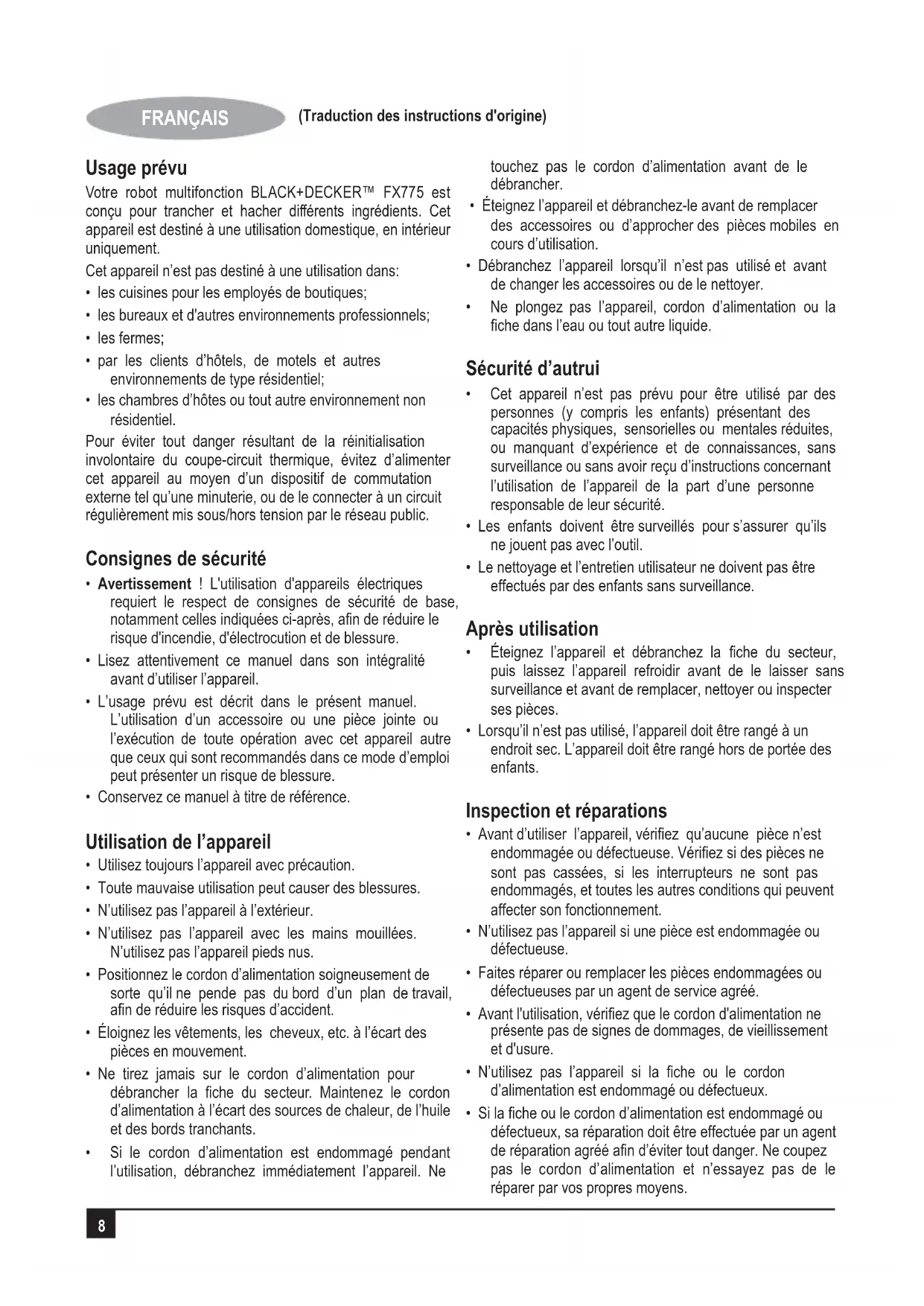 ENGLISH (Original instructions) - 240V FX775 Voltage 220 Frequency 50/60Hz Power 750W8 FRANÇAIS (Traduction des instructions d'origine) Usage prévu Votre robot multifonction BLACK+DECKER™ FX775 est conçu pour trancher et hacher différents ingrédients. Cet appareil est destiné à une utilisation domestique, en intérieur uniquement. Cet appareil n’est pas destiné à une utilisation dans:
