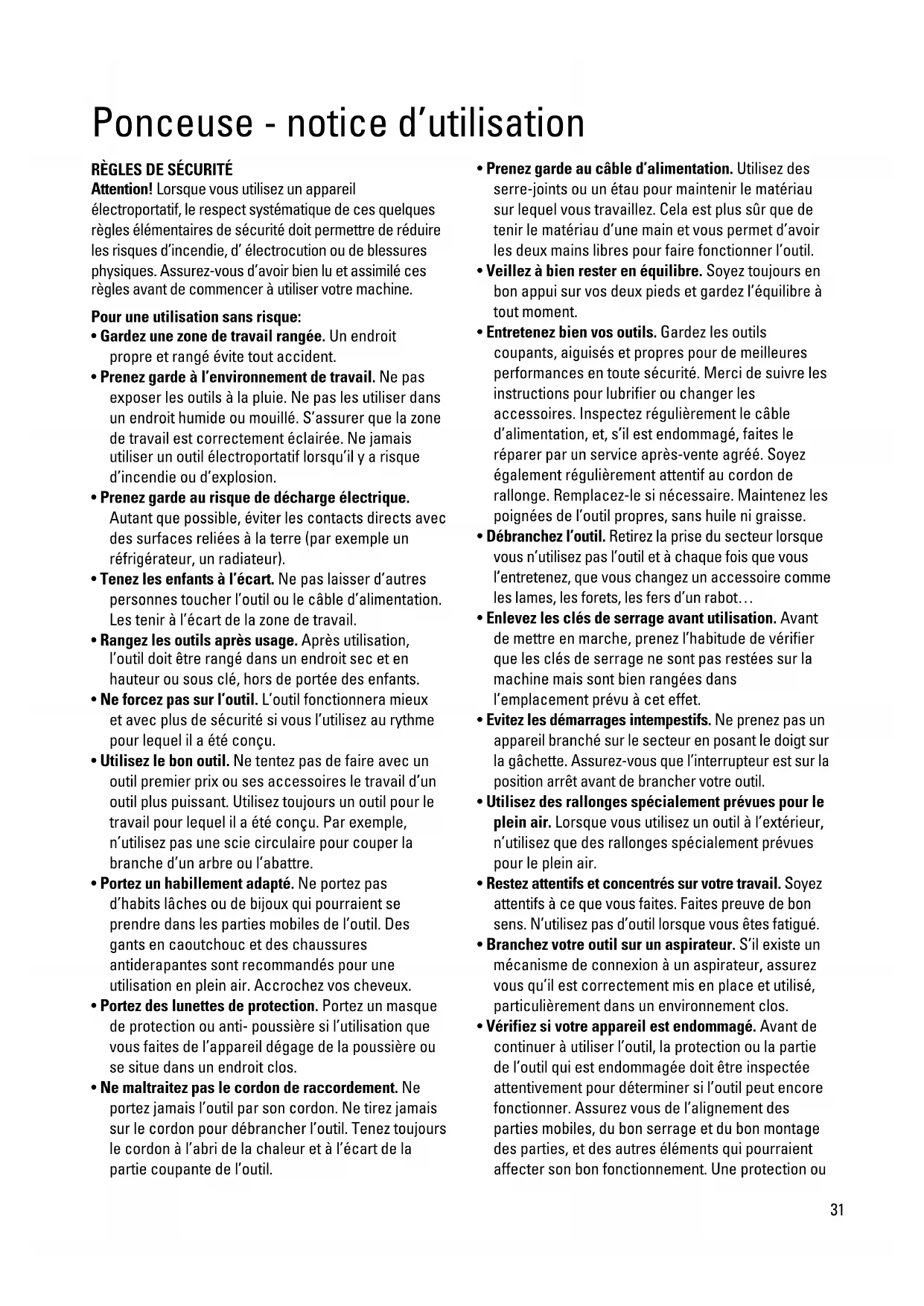 Attention! Lorsque vous utilisez un appareil électroportatif, le respect systématique de ces quelques règles élémentaires de sécurité doit permettre de réduire les risques d’incendie, d’ électrocution ou de blessures physiques. Assurez-vous d’avoir bien lu et assimilé ces règles avant de commencer à utiliser votre machine. Pour une utilisation sans risque: