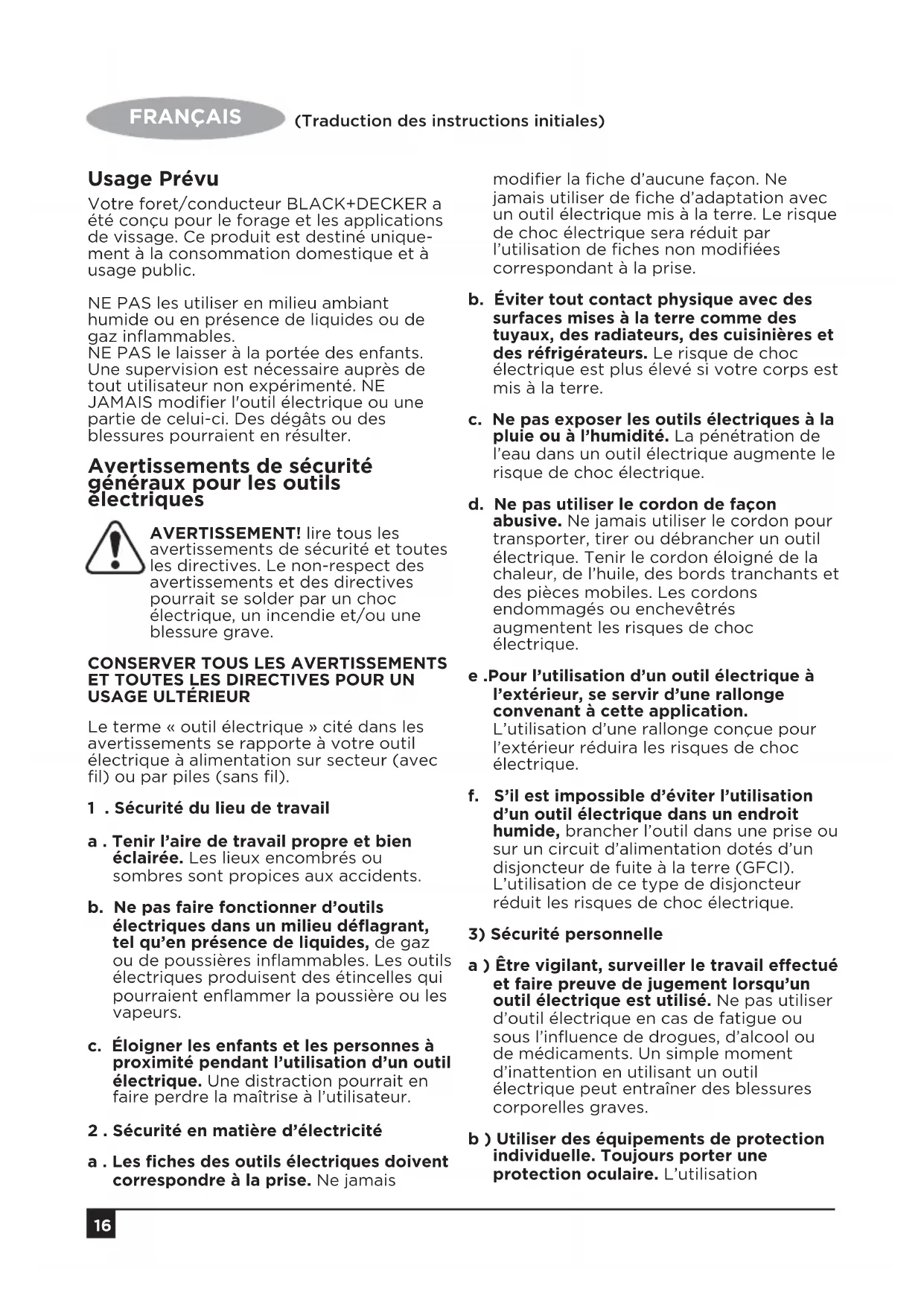- Repairs have been attempted by persons other than authorised repair agents or BLACK+DECKER service sta. To claim on the guarantee, you will need to submit proof of purchase to the seller or an authorised repair agent. You can check the location of your nearest authorised repair agent by contacting your local BLACK+DECKER oce at the address indicated in this manual. Alternatively, a list of authorised BLACK+DECKER repair agents and full details of our aftersales service and contacts are available on the Internet at: www.2helpU.com16 FRANÇAIS (Traduction des instructions initiales) Usage Prévu Votre foret/conducteur BLACK+DECKER a été conçu pour le forage et les applications de vissage. Ce produit est destiné unique- ment à la consommation domestique et à usage public. NE PAS les utiliser en milieu ambiant humide ou en présence de liquides ou de gaz inflammables. NE PAS le laisser à la portée des enfants. Une supervision est nécessaire auprès de tout utilisateur non expérimenté. NE JAMAIS modifier l'outil électrique ou une partie de celui-ci. Des dégâts ou des blessures pourraient en résulter. Avertissements de sécurité généraux pour les outils électriques AVERTISSEMENT! lire tous les avertissements de sécurité et toutes les directives. Le non-respect des avertissements et des directives pourrait se solder par un choc électrique, un incendie et/ou une blessure grave.