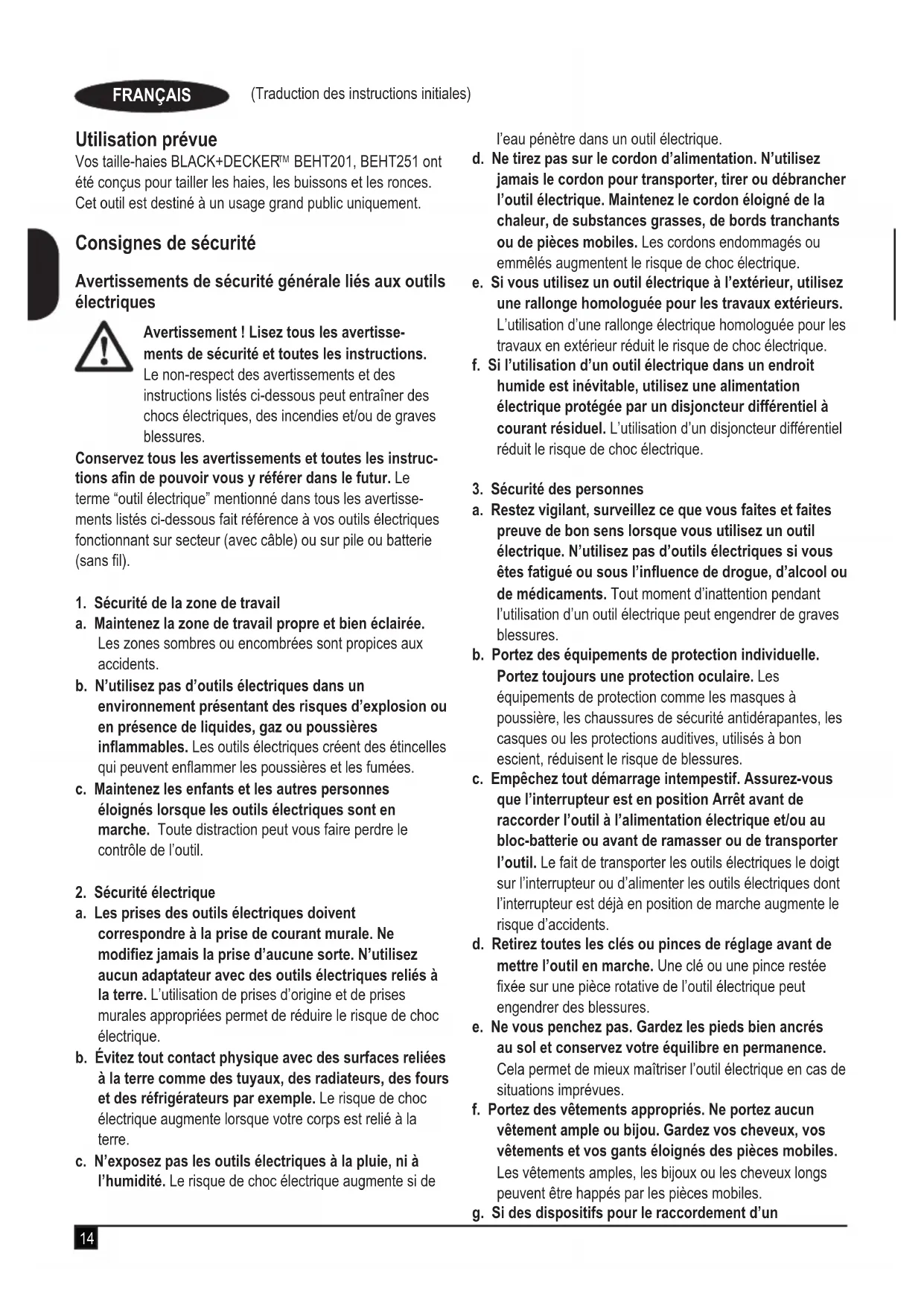 BEHT201, BEHT251 ont été conçus pour tailler les haies, les buissons et les ronces. Cet outil est destiné à un usage grand public uniquement. Consignes de sécurité Avertissements de sécurité générale liés aux outils électriques Avertissement ! Lisez tous les avertisse- ments de sécurité et toutes les instructions. Le non-respect des avertissements et des instructions listés ci-dessous peut entraîner des chocs électriques, des incendies et/ou de graves blessures. Conservez tous les avertissements et toutes les instruc- tions an de pouvoir vous y référer dans le futur. Le terme “outil électrique” mentionné dans tous les avertisse- ments listés ci-dessous fait référence à vos outils électriques fonctionnant sur secteur (avec câble) ou sur pile ou batterie (sans l).