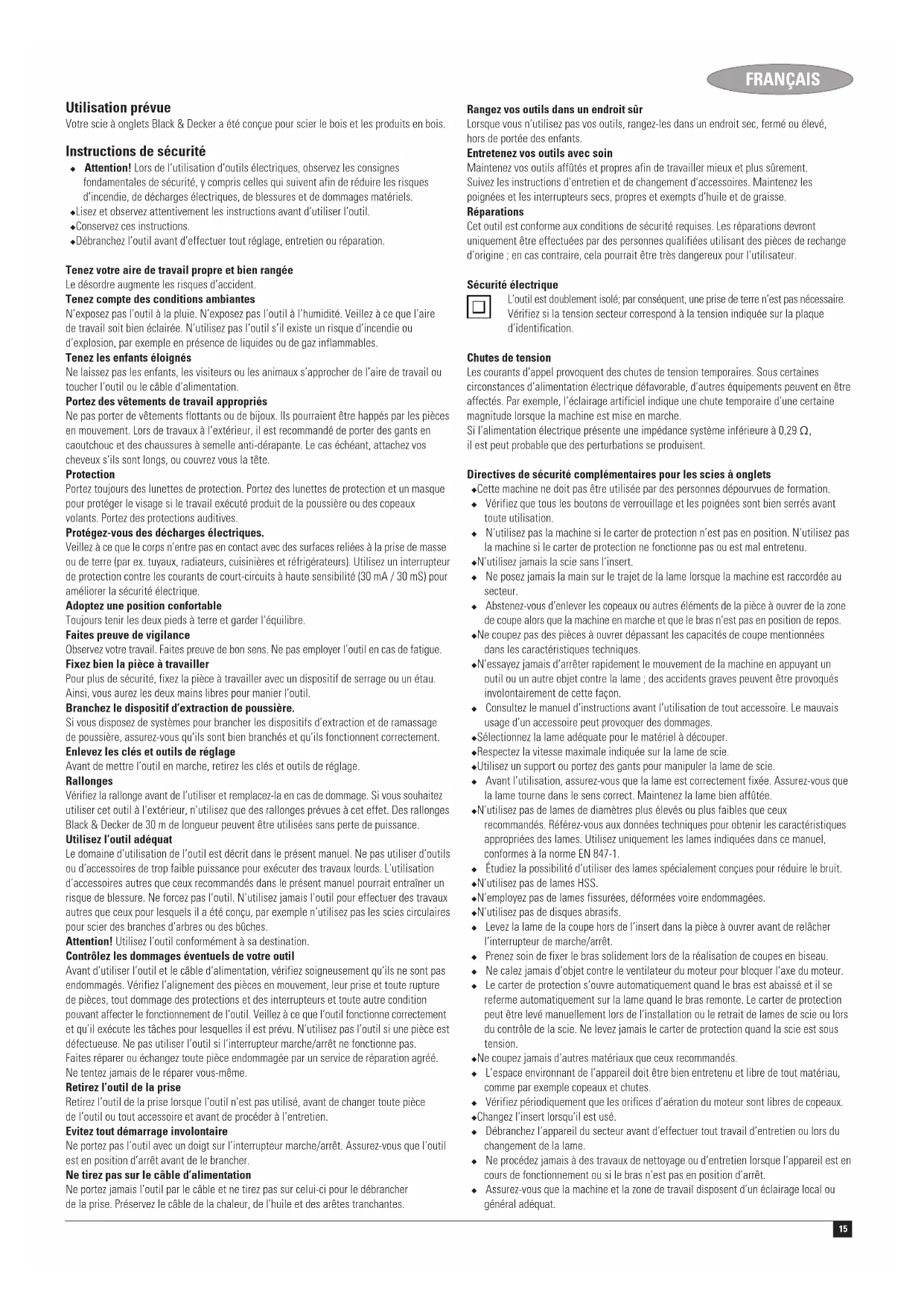 (Schalleistungs-Unsicherheitsfaktor) 3 dB(A) Kevin Hewitt Director of Consumer Engineering Spennymoor, County Durham DL16 6JG, Vereinigtes Königreich 1-7-2005 Garantie Black & Decker vertraut auf die Qualität der eigenen Werkzeuge und bietet dem Käufer eine außergewöhnliche Garantie. Diese Garantiezusage versteht sich unbeschadet der gesetzlichen Gewährleistungsansprüche und schränkt diese keinesfalls ein. Sie gilt in sämtlichen Mitgliedsstaaten der Europäischen Union und der Europäischen Freihandelszone EFTA. Falls sich ein Black & Decker XT Produkt (hierzu zählen nicht: Zubehör, Vorsatzgeräte, Batterien, Ladegeräte und Spannfutter) aufgrund von Materialfehlern, der Verarbeitung oder nicht konformer Ausführung innerhalb von 3 Jahren ab dem Kaufdatum als fehlerhaft herausstellt, so garantiert Black & Decker, sämtliche defekten Teile zu erneuern, Produkte, die normalem Verschleiß ausgesetzt waren, zu reparieren oder solche Produkte zu erneuern, vorausgesetzt, daß das Produkt innerhalb von 90 Tagen ab Kaufdatum auf der Black & Decker XT Garantie-Webseite registriert wurde. Wird das Produkt nicht registriert, so gilt nur die Standardgarantie (2 Jahre).14 DEUTSCH Die Garantie erlischt, falls: ◆ das Werkzeug gewerblich, beruflich oder im Verleihgeschäft benutzt wurde; ◆ das Werkzeug mißbräuchlich verwendet oder mit mangelnder Sorgfalt behandelt wurde; ◆ das Werkzeug durch irgendwelche Fremdeinwirkung beschädigt wurde; ◆ Reparaturen von hierzu unberechtigten Personen durchgeführt wurden; ◆ das Produkt dahingehend verändert wurde, daß die ursprünglichen Spezifikationen nicht mehr gültig sind; ◆ ungeeignetes Zubehör oder ungeeignete Vorsatzgeräte verwendet wurden. Die verlängerte Garantie erlischt, falls: ◆ Kaufbeleg und Original-Garantiezertifikat für die verlängerte Garantie nicht vorgelegt werden. Lassen Sie Ihr Produkt jetzt online registrieren unter www.blackanddecker.de/xt, um die verlängerte Garantie (3 Jahre) in Anspruch nehmen zu können und um über neue Produkte und Sonderangebote auf dem Laufenden gehalten zu werden. Zur Inanspruchnahme dieser Garantie ist dem Verkäufer bzw. der Vertragswerkstatt ein Kaufnachweis vorzulegen. Die Adresse der zuständigen Black & Decker Vertretung steht in diesem Handbuch, darüber läßt sich die nächstgelegene Vertragswerkstatt ermitteln. Außerdem ist eine Liste der Vertragswerkstätten und aller Kundendienststellen von Black & Decker sowie der zuständigen Ansprechpartner im Internet zu finden unter: www.2helpU.com Weitere Informationen über die Marke Black & Decker und unsere Produkte finden Sie unter folgender Adresse: www.blackanddecker.de15 FRANÇAIS Utilisation prévue Votre scie à onglets Black & Decker a été conçue pour scier le bois et les produits en bois. Instructions de sécurité ◆ Attention! Lors de l’utilisation d’outils électriques, observez les consignes fondamentales de sécurité, y compris celles qui suivent afin de réduire les risques d’incendie, de décharges électriques, de blessures et de dommages matériels. ◆ Lisez et observez attentivement les instructions avant d’utiliser l’outil. ◆ Conservez ces instructions. ◆ Débranchez l’outil avant d’effectuer tout réglage, entretien ou réparation. Tenez votre aire de travail propre et bien rangée Le désordre augmente les risques d’accident. Tenez compte des conditions ambiantes N’exposez pas l’outil à la pluie. N’exposez pas l’outil à l’humidité. Veillez à ce que l’aire de travail soit bien éclairée. N’utilisez pas l’outil s’il existe un risque d’incendie ou d’explosion, par exemple en présence de liquides ou de gaz inflammables. Tenez les enfants éloignés Ne laissez pas les enfants, les visiteurs ou les animaux s’approcher de l’aire de travail ou toucher l’outil ou le câble d’alimentation. Portez des vêtements de travail appropriés Ne pas porter de vêtements flottants ou de bijoux. Ils pourraient être happés par les pièces en mouvement. Lors de travaux à l’extérieur, il est recommandé de porter des gants en caoutchouc et des chaussures à semelle anti-dérapante. Le cas échéant, attachez vos cheveux s’ils sont longs, ou couvrez vous la tête. Protection Portez toujours des lunettes de protection. Portez des lunettes de protection et un masque pour protéger le visage si le travail exécuté produit de la poussière ou des copeaux volants. Portez des protections auditives. Protégez-vous des décharges électriques. Veillez à ce que le corps n’entre pas en contact avec des surfaces reliées à la prise de masse ou de terre (par ex. tuyaux, radiateurs, cuisinières et réfrigérateurs). Utilisez un interrupteur de protection contre les courants de court-circuits à haute sensibilité (30 mA / 30 mS) pour améliorer la sécurité électrique. Adoptez une position confortable Toujours tenir les deux pieds à terre et garder l’équilibre. Faites preuve de vigilance Observez votre travail. Faites preuve de bon sens. Ne pas employer l’outil en cas de fatigue. Fixez bien la pièce à travailler Pour plus de sécurité, fixez la pièce à travailler avec un dispositif de serrage ou un étau. Ainsi, vous aurez les deux mains libres pour manier l’outil. Branchez le dispositif d’extraction de poussière. Si vous disposez de systèmes pour brancher les dispositifs d’extraction et de ramassage de poussière, assurez-vous qu’ils sont bien branchés et qu’ils fonctionnent correctement. Enlevez les clés et outils de réglage Avant de mettre l’outil en marche, retirez les clés et outils de réglage. Rallonges Vérifiez la rallonge avant de l’utiliser et remplacez-la en cas de dommage. Si vous souhaitez utiliser cet outil à l’extérieur, n’utilisez que des rallonges prévues à cet effet. Des rallonges Black & Decker de 30 m de longueur peuvent être utilisées sans perte de puissance. Utilisez l’outil adéquat Le domaine d’utili