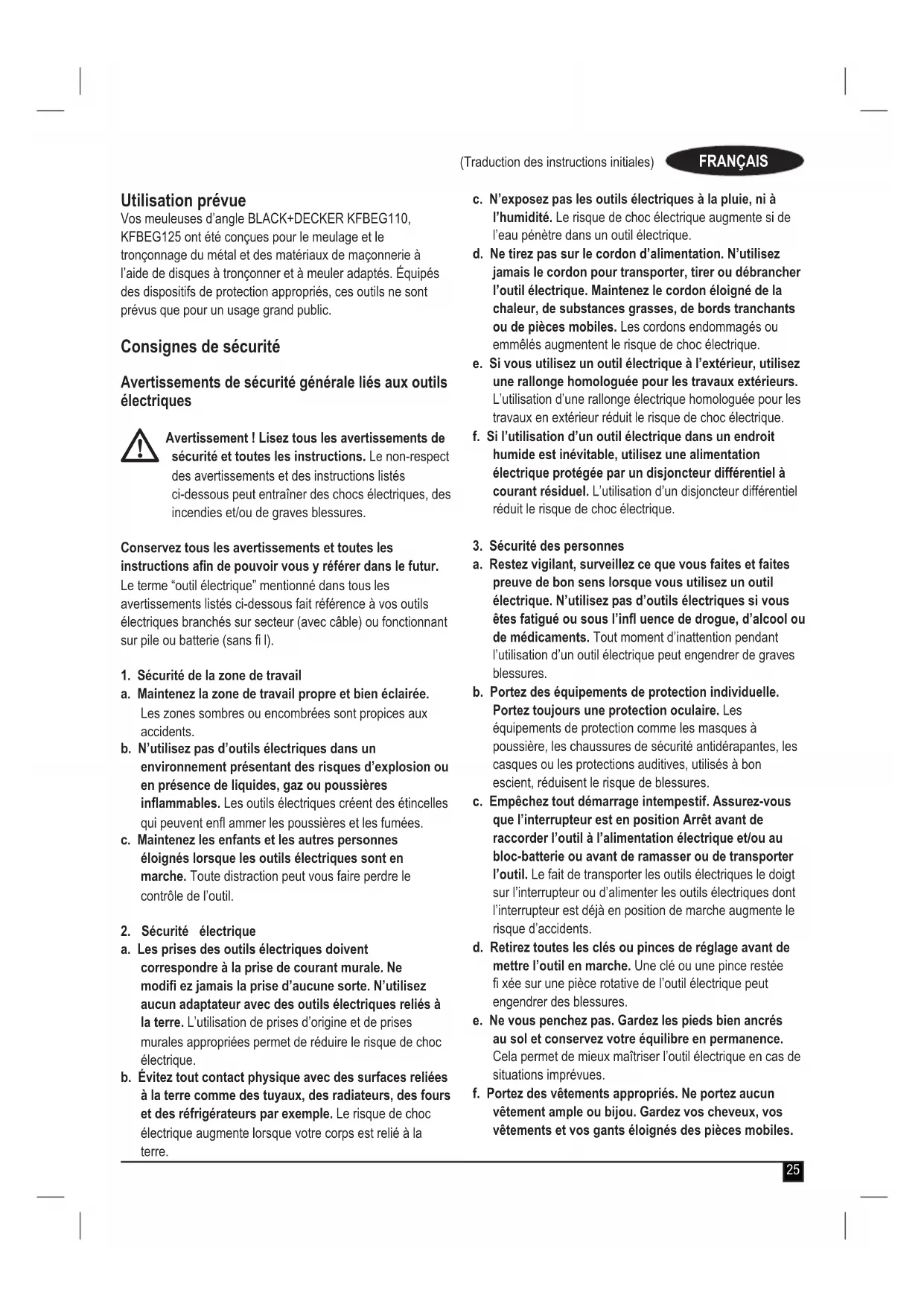 Meuleuses d’angle KFBEG110, KFBEG125 Black & Decker déclare que les produits décrits dans les “Caractéristiques techniques” sont conformes aux normes : 2006/42/CE, EN 60745-1:2009 +A11:2010 ; EN 60745-2-3:2011 + A2:2013 + A11:2014 + A12:2014 + A13:2015 Ces produits sont également conformes aux Directives 2014/30/UE et 2011/65/UE. Pour plus de détails, veuillez contacter Black & Decker à l’adresse suivante ou consultez la dernière page du manuel. Le soussigné est responsable de la compilation des données de la fi che technique et fait cette déclaration au nom de Black & Decker. R. Laverick Directeur Ingénierie Black & Decker Europe, 210 Bath Road, Slough, Berkshire, SL1 3YD Royaume-Uni 27/09/2017 Garantie Black & Decker est sûr de la qualité de ses produits et offre une garantie de 24 mois aux utilisateurs, à partir de la date d’achat. Cette garantie s’ajoute à vos droits légaux auxquels elle ne porte aucunement préjudice. Cette garantie est valable au sein des territoires des États membres de l’Union Européenne et au sein de la Zone européenne de libre- échange. Pour prétendre à la garantie, la réclamation doit être conforme aux conditions générales de Black & Decker et vous devez fournir une preuve d’achat au vendeur ou au réparateur agréé. Les conditions générales de la garantie de 2 ans Black & Decker ainsi que l’adresse du réparateur agrée le plus proche sont disponibles sur le site Internet www.2helpU.com ou en contactant votre agence Black & Decker locale à l’adresse indiquée dans ce manuel. Veuillez consulter notre site Internet www.blackanddecker.co. uk pour enregistrer votre nouveau produit Black & Decker et pour être tenu informé des nouveaux produits et offres spéciales.36 (Traduzione del testo originale) ITALIANO Uso previsto Le smeragliatrici angolari BLACK+DECKER KFBEG110, KFBEG125 sono state progettate per la molatura e il taglio di metallo e muratura usando il tipo appropriato di disco di taglio o mola. Una volta montata la protezione appropriata, questi utensili sono destinati esclusivamente all’uso da parte del consumatore. Istruzioni di sicurezza Avvertenze di sicurezza generali per gli elettroutensili