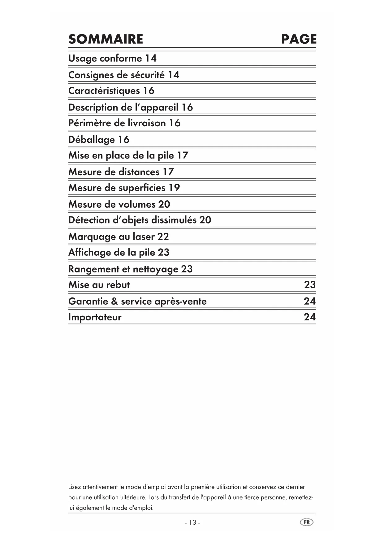 BURGSTRASSE 21 44867 BOCHUM, GERMANY www.kompernass.com IAN 107555 IAN 107555 IAN 107555- 13 - SOMMAIRE PAGE Usage conforme 14 Consignes de sécurité 14 Caractéristiques 16 Description de l’appareil 16 Périmètre de livraison 16 Déballage 16 Mise en place de la pile 17 Mesure de distances 17 Mesure de superficies 19 Mesure de volumes 20 Détection d’objets dissimulés 20 Marquage au laser 22 Affichage de la pile 23 Rangement et nettoyage 23 Mise au rebut 23 Garantie & service après-vente 24 Importateur 24 Lisez attentivement le mode d'emploi avant la première utilisation et conservez ce dernier pour une utilisation ultérieure. Lors du transfert de l'appareil à une tierce personne, remettez- lui également le mode d'emploi.- 14 -