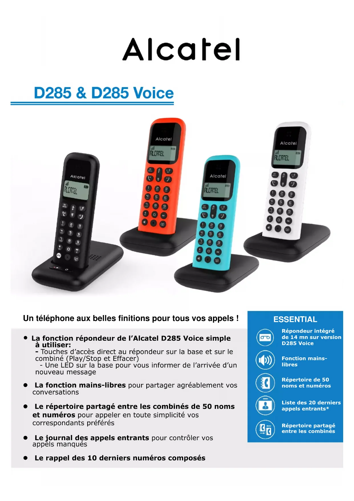 - La fonction répondeur de l’Alcatel D285 Voice simple à utiliser: - Touches d’accès direct au répondeur sur la base et sur le combiné (Play/Stop et Effacer) - Une LED sur la base pour vous informer de l’arrivée d’un nouveau message ⚫ La fonction mains-libres pour partager agréablement vos conversations ⚫ Le répertoire partagé entre les combinés de 50 noms et numéros pour appeler en toute simplicité vos correspondants préférés ⚫ Le journal des appels entrants pour contrôler vos appels manqués ⚫ Le rappel des 10 derniers numéros composés Répertoire de 50 noms et numéros Liste des 20 derniers appels entrants* ESSENTIAL Fonction mains- libres Un téléphone aux belles finitions pour tous vos appels ! Répertoire partagé entre les combinés Répondeur intégré de 14 mn sur version D285 VoiceAFFICHEUR