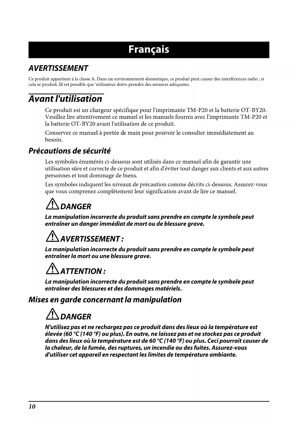 Approx. 3 hours Temperature/humidity During operation 0 to 40°C {32 to 104°F}, 10 to 90% RH During storage High temperature and humidity: 50°C {122°F}, 90% RH for 120 hours High temperature: 70°C {158°F} for 120 hours Low temperature: -25°C {-13°F} for 120 hours External dimensions (W × D × H) 110 × 133 × 64 mm {4.33 × 5.24 × 2.52”} Weight Approx. 0.3 kg {0.66 lb}10 Français AVERTISSEMENT Ce produit appartient à la classe A. Dans un environnement domestique, ce produit peut causer des interférences radio ; si cela se produit, lil est possible que 'utilisateur doive prendre des mesures adéquates. Avant l'utilisation Ce produit est un chargeur spécifique pour l'imprimante TM-P20 et la batterie OT-BY20. Veuillez lire attentivement ce manuel et les manuels fournis avec l'imprimante TM-P20 et la batterie OT-BY20 avant l'utilisation de ce produit.Conservez ce manuel à portée de main pour pouvoir le consulter immédiatement au besoin. Précautions de sécurité Les symboles énumérés ci-dessous sont utilisés dans ce manuel afin de garantir une utilisation sûre et correcte de ce produit et afin d'éviter tout danger aux clients et aux autres personnes et tout dommage de biens.Les symboles indiquent les niveaux de précaution comme décrits ci-dessous. Assurez-vous que vous comprenez complètement leur signification avant de lire ce manuel. !DANGER La manipulation incorrecte du produit sans prendre en compte le symbole peut entraîner un danger immédiat de mort ou de blessure grave. !AVERTISSEMENT : La manipulation incorrecte du produit sans prendre en compte le symbole peut entraîner la mort ou une blessure grave. !ATTENTION : La manipulation incorrecte du produit sans prendre en compte le symbole peut entraîner des blessures et des dommages matériels. Mises en garde concernant la manipulation !DANGER N'utilisez pas et ne rechargez pas ce produit dans des lieux où la température est élevée (60 °C {140 °F} ou plus). En outre, ne laissez pas et ne stockez pas ce produit dans des lieux où la température est de 60 °C {140 °F} ou plus. Ceci pourrait causer de la chaleur, de la fumée, des ruptures, un incendie ou des fuites. Assurez-vous d'utiliser cet appareil en respectant les limites de température ambiante.11 !AVERTISSEMENT :