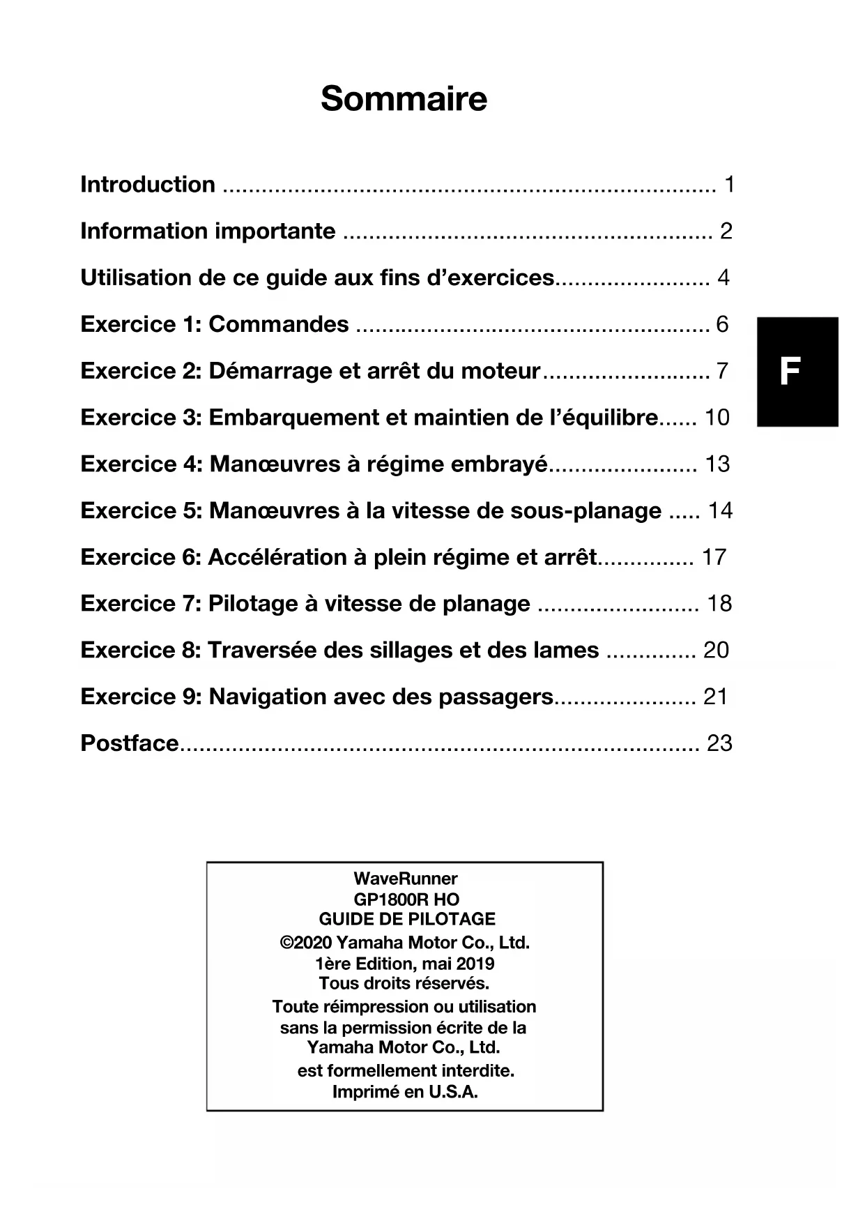 portement du scooter nautique avec des passagers à bord. F2W-T73-forPrint.book Page 22 Friday, June 21, 2019 10:23 AM–23– Postface L’utilisation d’un scooter nautique requiert du bon sens et un jugement sûr, ainsi que des compétences et une connaissance qui ne s’acquièrent qu’au fur et à mesure de la familia- risation des utilisateurs avec leur véhicule. Bien que la pratique des exercices contenus dans ce guide vous aide à acquérir les compétences nécessaires, vous devez rester conscient de vos limites et ne jamais les dépasser lorsque vous continuerez à vous perfec- tionner. F2W-T73-forPrint.book Page 23 Friday, June 21, 2019 10:23 AME