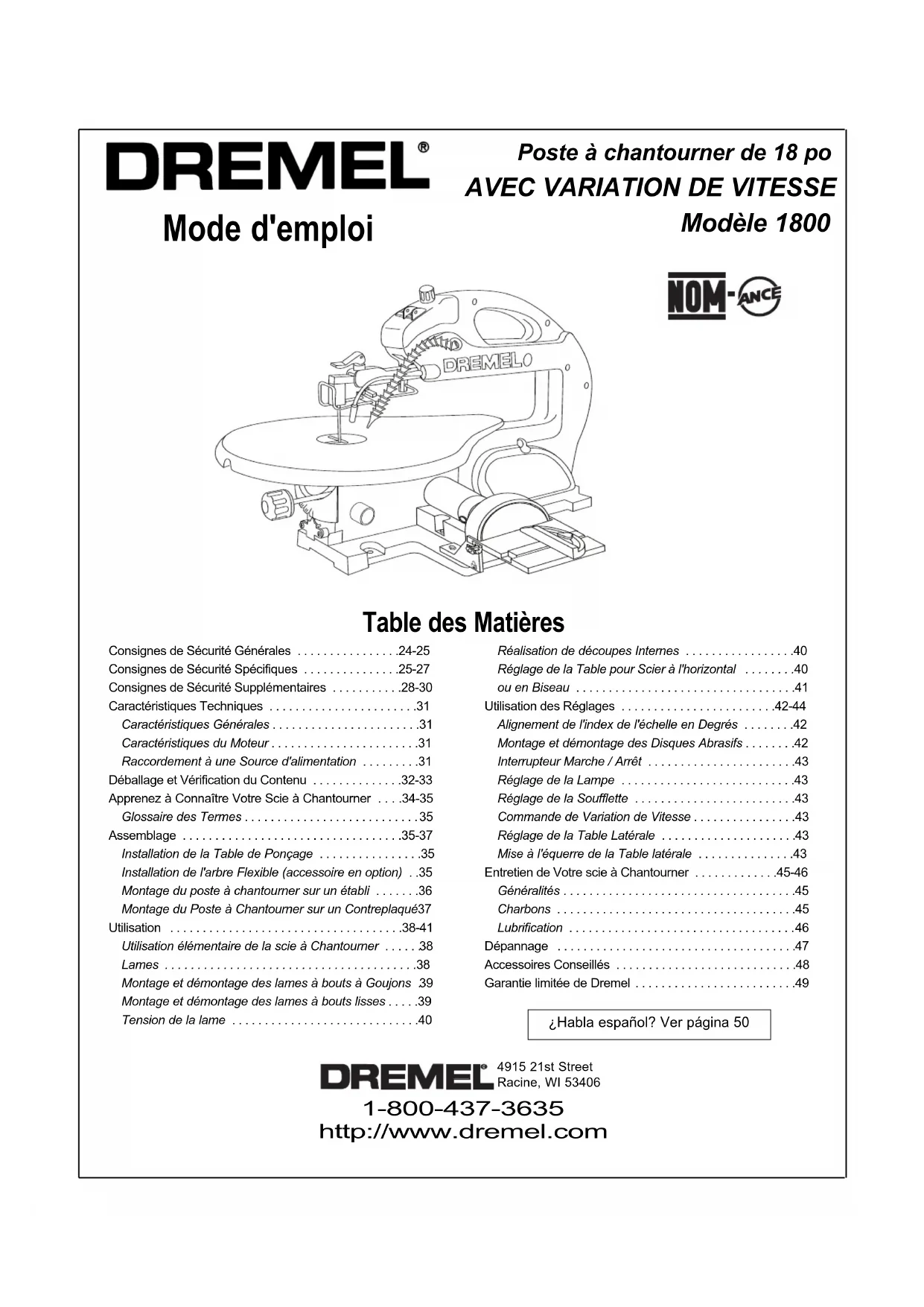 Modèle 1800 4915 21st StreetRacine, WI 53406 1-800-437-3635 http://www.dremel.com Consignes de Sécurité Générales . . . . . . . . . . . . . . . .24-25Consignes de Sécurité Spécifiques . . . . . . . . . . . . . . .25-27Consignes de Sécurité Supplémentaires . . . . . . . . . . .28-30Caractéristiques Techniques . . . . . . . . . . . . . . . . . . . . . . .31Caractéristiques Générales . . . . . . . . . . . . . . . . . . . . . . .31Caractéristiques du Moteur . . . . . . . . . . . . . . . . . . . . . . .31Raccordement à une Source d'alimentation . . . . . . . . .31Déballage et Vérification du Contenu . . . . . . . . . . . . . .32-33Apprenez à Connaître Votre Scie à Chantourner . . . .34-35Glossaire des Termes . . . . . . . . . . . . . . . . . . . . . . . . . . . Assemblage . . . . . . . . . . . . . . . . . . . . . . . . . . . . . . . . . .35-37Installation de la Table de Ponçage . . . . . . . . . . . . . . . .35Installation de l'arbre Flexible (accessoire en option) . .35Montage du poste à chantourner sur un établi . . . . . . .36Montage du Poste à Chantourner sur un Contreplaqué37Utilisation . . . . . . . . . . . . . . . . . . . . . . . . . . . . . . . . . . . .38-41Utilisation élémentaire de la scie à Chantourner . . . . . . Lames . . . . . . . . . . . . . . . . . . . . . . . . . . . . . . . . . . . . . . .38Montage et démontage des lames à bouts à Goujons . Montage et démontage des lames à bouts lisses . . . . .39Tension de la lame . . . . . . . . . . . . . . . . . . . . . . . . . . . . .40Réalisation de découpes Internes . . . . . . . . . . . . . . . . .40Réglage de la Table pour Scier à l'horizontal . . . . . . . .40ou en Biseau . . . . . . . . . . . . . . . . . . . . . . . . . . . . . . . . . .41Utilisation des Réglages . . . . . . . . . . . . . . . . . . . . . . . .42-44Alignement de l'index de l'échelle en Degrés . . . . . . . .42Montage et démontage des Disques Abrasifs . . . . . . . .42 Interrupteur Marche / Arrêt . . . . . . . . . . . . . . . . . . . . . . .43 Réglage de la Lampe . . . . . . . . . . . . . . . . . . . . . . . . . . .43Réglage de la Soufflette . . . . . . . . . . . . . . . . . . . . . . . . .43Commande de Variation de Vitesse . . . . . . . . . . . . . . . .