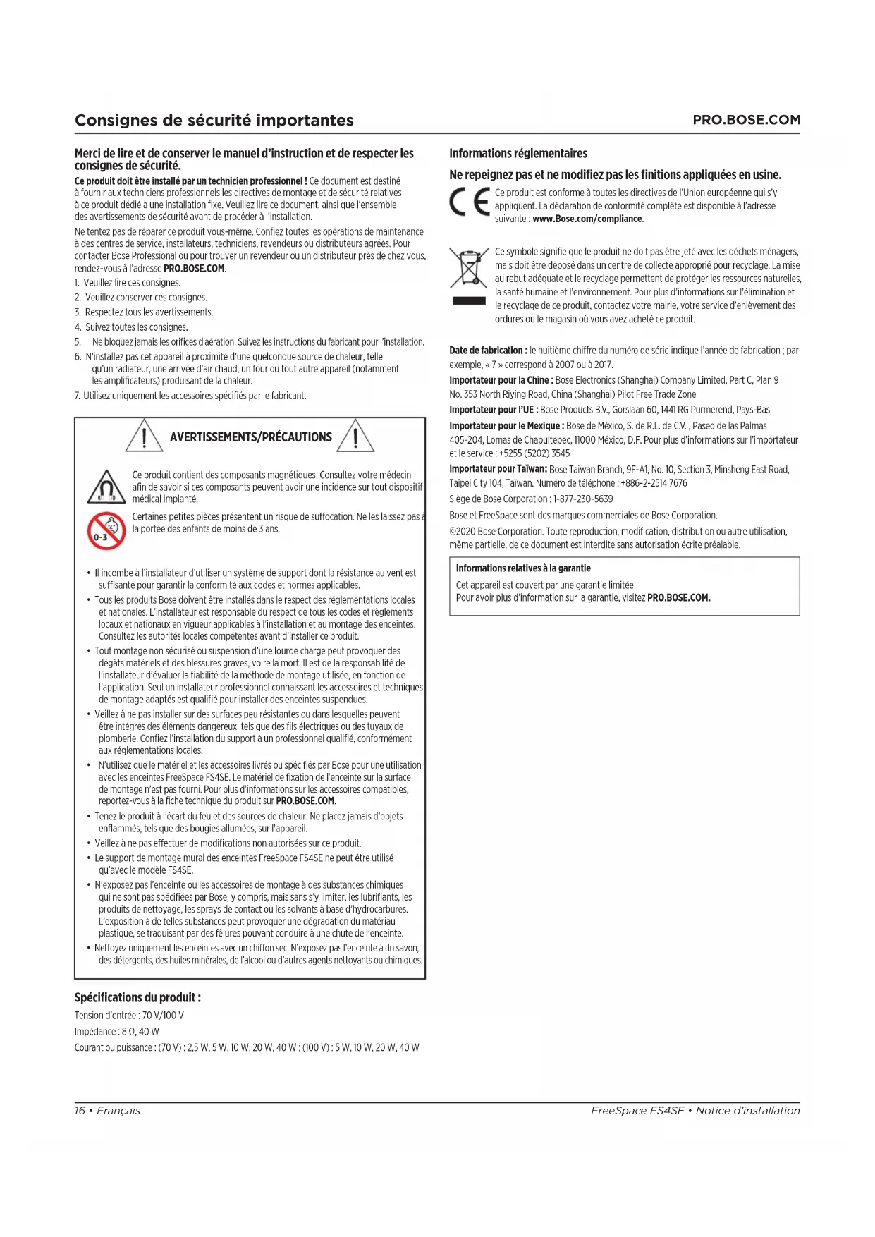 Bose Taiwan Branch, 9F-A1, No. 10, Section 3, Minsheng East Road, Taipei City 104, Taïwan. Numéro de téléphone: +886-2-2514 7676 Siège de Bose Corporation: 1-877-230-5639 Bose et FreeSpace sont des marques commerciales de Bose Corporation. ©2020 Bose Corporation. Toute reproduction, modification, distribution ou autre utilisation, même partielle, de ce document est interdite sans autorisation écrite préalable. Informations relatives à la garantie Cet appareil est couvert par une garantie limitée. Pour avoir plus d’information sur la garantie, visitez PRO.BOSE.COM. Spécifications du produit: Tension d’entrée: 70V/100V Impédance: 8Ω, 40W Courant ou puissance: (70V): 2,5W, 5W, 10W, 20W, 40W; (100V): 5W, 10W, 20W, 40WFrançais • 17Notice d’installation • FreeSpace FS4SE