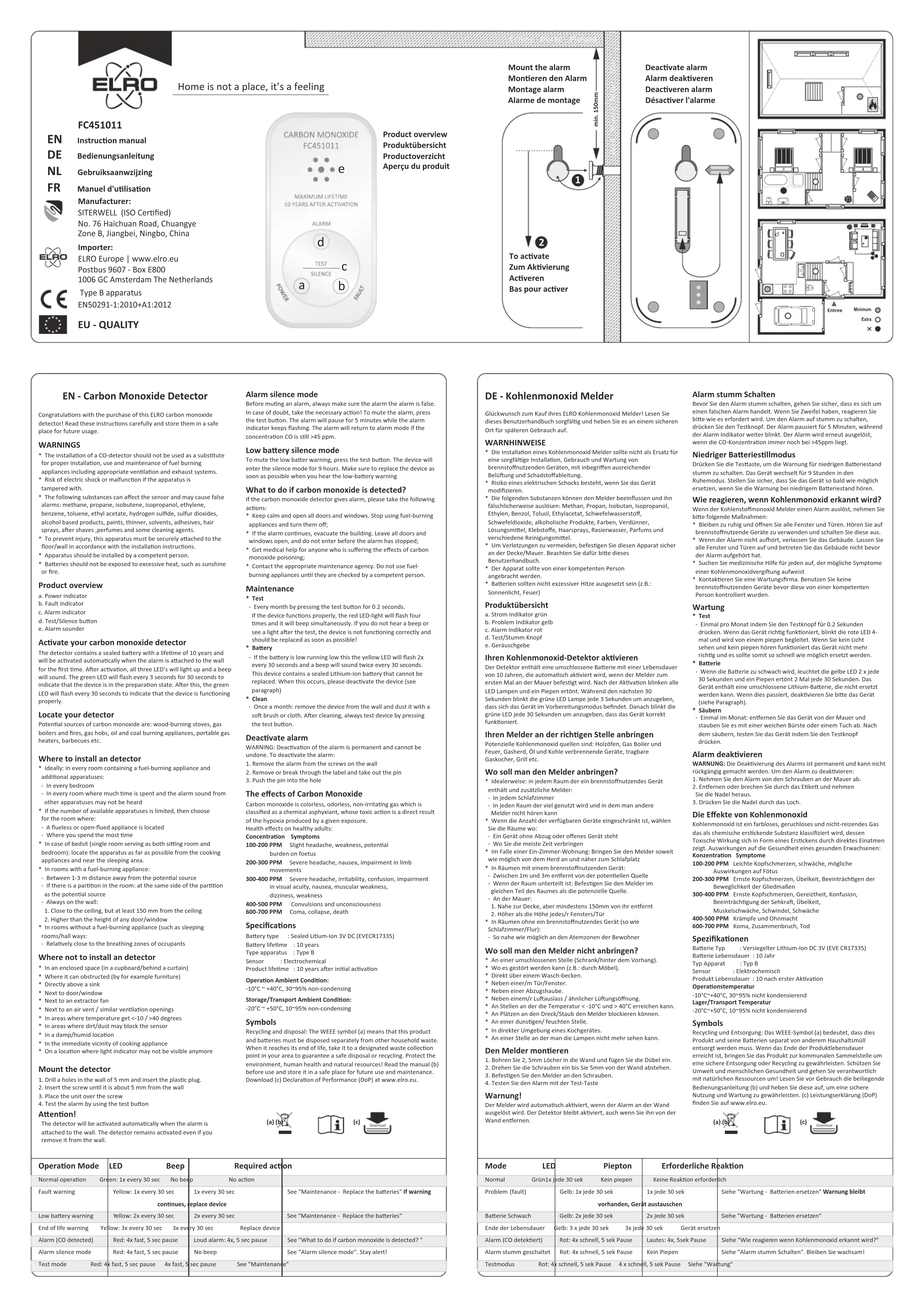 Les effets du monoxyde de carbone Monoxyde de carbone est un gaz incolore, inodore et non-irritant classifié comme asphyxiant chimique. L’acon toxique est un résultat direct de l’hypoxie produite par une exposion directe. Effets sur la santé d’un adulte en bonne santé : Concentraon Symptômes 100-200 PPM Maux de tête doux, faiblesse, effets possibles sur fœtus 200-300 PPM Maux de tête forts, nausée, déficience de mouvement des extrémités 300-400 PPM Maux de tête forts, irritabilité, confusion, déficience de vue, nausée, faiblesse des muscles, verges, faiblesse 400-500 PPM Convulsions et inconscience 600-700 PPM Coma, effondrement, mort Caractérisques Type de baerie : Lithium-Ion scellé 3V DC (EVE CR17335) Durée de vie de la baerie : 2 années Type d’appareil : Type B Détecteur : Électrochimique Durée de vie du produit : 10 ans après l’acvaon iniale Ambiance d’opéraon -10°C ~ +40°C, 30 ~ 95% non-condensant Ambiance de stockage/transport -20°C ~+ 50°C, 10 ~ 95% non-condensant Symbols Recyclage et mise au rebut: Le symbole WEEE (a) signifie que ce produit et baeries ne doivent pas être jeté avec les ordures. Une fois le produit arrivée en fin de vie, déposez-la au centre de tri le plus proche de chez vous, où elle sera mise au rebut ou recyclée en toute sécurité. Protéger l'environnement, la santé des personnes et des ressources naturelles! Veuillez lire aenvement le manuel (b) avant ulisaon et le conserver à un endroit sûr. (c) Déclaraon de Performance (DoP) aller à www.elro.eu. (a) (b) Download (c)(a) (b) Download (c) NL Koolmonoxidemelder Gefeliciteerd met de aankoop van deze ELRO koolmonoxidemelder! Lees deze instruces zorgvuldig door en berg ze op een veilige plaats op voor toekomsg gebruik. WAARSCHUWINGEN