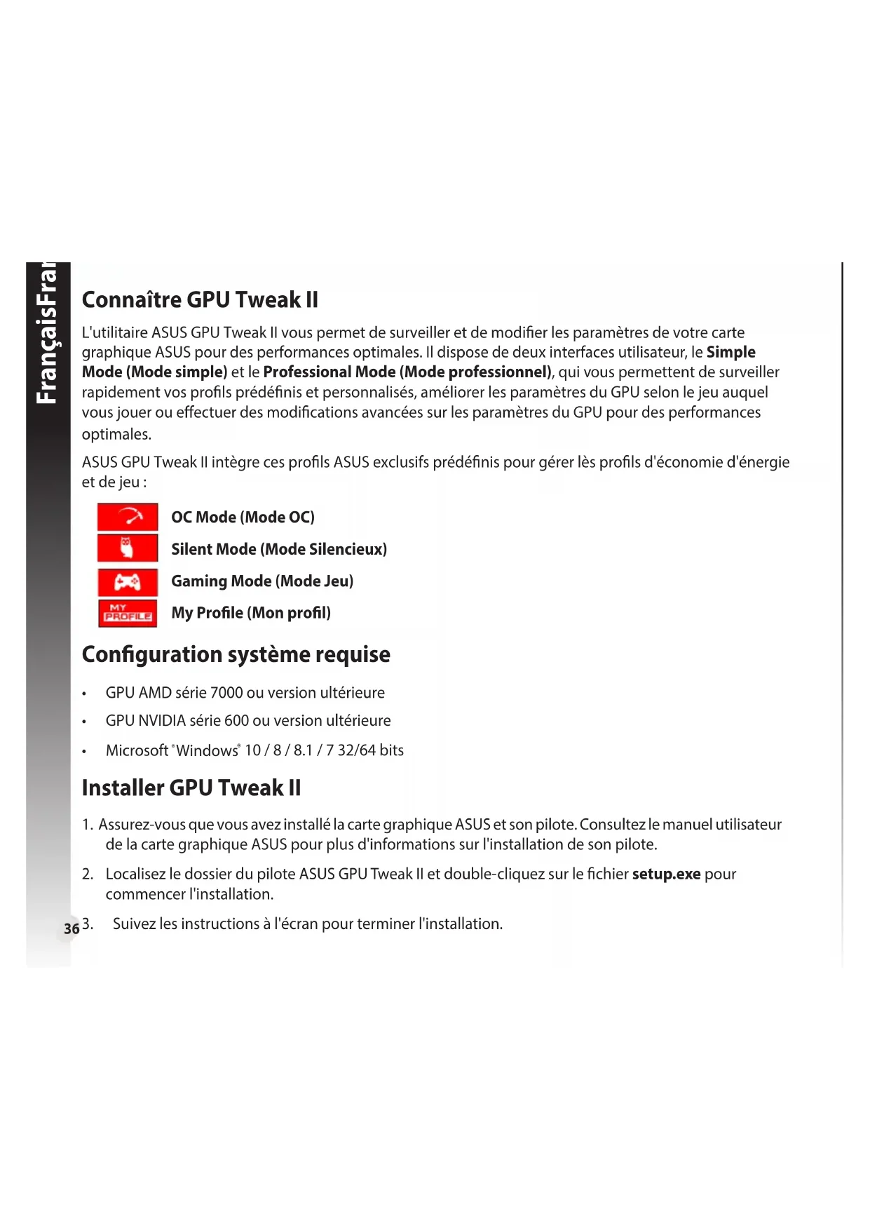 開啟 / 關閉鍵盤快捷鍵以快速顯示主菜單或應用快速調整。 鍵盤快捷鍵設置36 FrançaisFrançais Connaître GPU Tweak II L'utilitaire ASUS GPU Tweak II vous permet de surveiller et de modier les paramètres de votre carte graphique ASUS pour des performances optimales. Il dispose de deux interfaces utilisateur, le Simple Mode (Mode simple) et le Professional Mode (Mode professionnel), qui vous permettent de surveiller rapidement vos prols prédénis et personnalisés, améliorer les paramètres du GPU selon le jeu auquel vous jouer ou eectuer des modications avancées sur les paramètres du GPU pour des performances optimales. ASUS GPU Tweak II intègre ces prols ASUS exclusifs prédénis pour gérer lès prols d'économie d'énergie et de jeu : OC Mode (Mode OC) Silent Mode (Mode Silencieux) Gaming Mode (Mode Jeu) My Prole (Mon prol) Conguration système requise