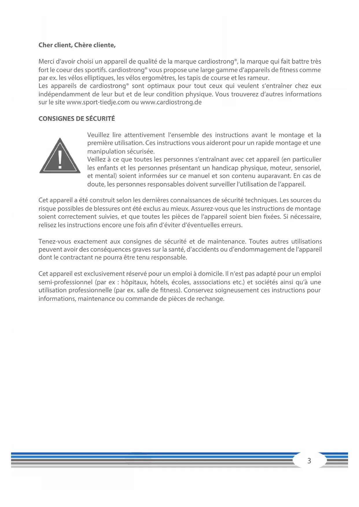 Cher client, Chère cliente, Merci d‘avoir choisi un appareil de qualité de la marque cardiostrong®, la marque qui fait battre très fort le coeur des sportifs. cardiostrong® vous propose une large gamme d‘appareils de tness comme par ex. les vélos elliptiques, les vélos ergomètres, les tapis de course et les rameur. Les appareils de cardiostrong® sont optimaux pour tout ceux qui veulent s‘entraîner chez eux indépendamment de leur but et de leur condition physique. Vous trouverez d‘autres informations sur le site www.sport-tiedje.com ou www.cardiostrong.de