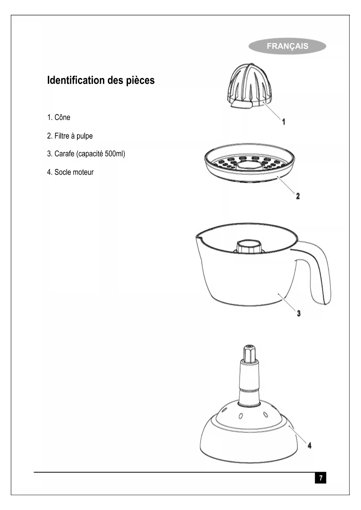 FRANÇAIS Utilisation prévue Votre presse-agrumes Black & Decker a été conçu pour extraire le jus des agrumes. Cet appareil est uniquement destiné à un usage domestique à l’intérieur. Lisez ce manuel attentivement avant d’utiliser l’appareil. Consignes de sécurité Avertissement! Lorsqu’on utilise un appareil électrique, il faut toujours respecter certaines règles de sécurité fondamentales, notamment les suivantes, afin de prévenir les risques d’incendie, de décharges électriques ou de blessures corporelles.