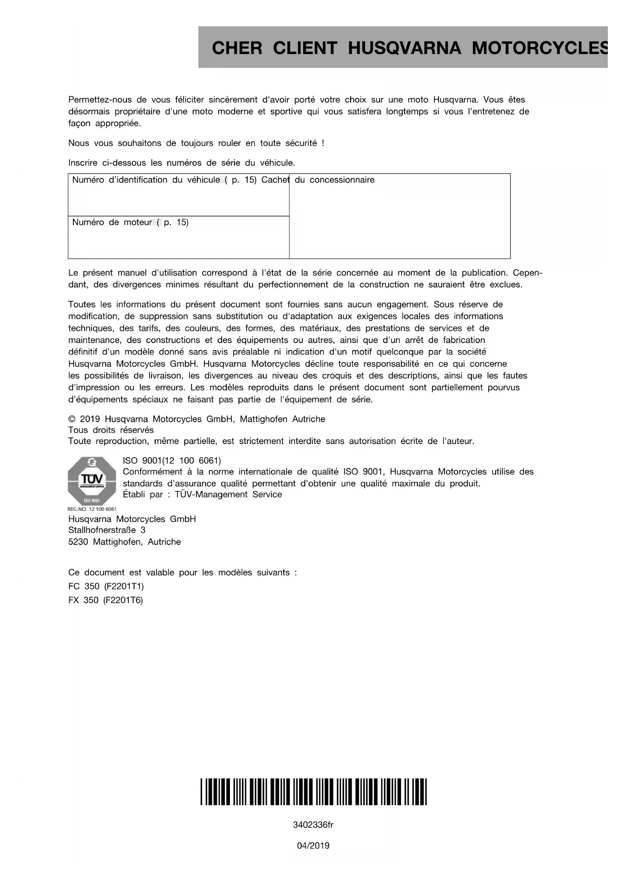 Permettez-nous de vous féliciter sincèrement d'avoir porté votre choix sur une moto Husqvarna. Vous êtes désormais propriétaire d'une moto moderne et sportive qui vous satisfera longtemps si vous l'entretenez de façon appropriée. Nous vous souhaitons de toujours rouler en toute sécurité ! Inscrire ci-dessous les numéros de série du véhicule. Numéro d’identification du véhicule ( p. 15) Cachet du concessionnaire Numéro de moteur ( p. 15) Le présent manuel d'utilisation correspond à l'état de la série concernée au moment de la publication. Cepen- dant, des divergences minimes résultant du perfectionnement de la construction ne sauraient être exclues. Toutes les informations du présent document sont fournies sans aucun engagement. Sous réserve de modification, de suppression sans substitution ou d'adaptation aux exigences locales des informations techniques, des tarifs, des couleurs, des formes, des matériaux, des prestations de services et de maintenance, des constructions et des équipements ou autres, ainsi que d'un arrêt de fabrication définitif d'un modèle donné sans avis préalable ni indication d'un motif quelconque par la société Husqvarna Motorcycles GmbH. Husqvarna Motorcycles décline toute responsabilité en ce qui concerne les possibilités de livraison, les divergences au niveau des croquis et des descriptions, ainsi que les fautes d'impression ou les erreurs. Les modèles reproduits dans le présent document sont partiellement pourvus d'équipements spéciaux ne faisant pas partie de l'équipement de série. © 2019 Husqvarna Motorcycles GmbH, Mattighofen Autriche Tous droits réservés Toute reproduction, même partielle, est strictement interdite sans autorisation écrite de l'auteur. ISO 9001(12 100 6061) Conformément à la norme internationale de qualité ISO 9001, Husqvarna Motorcycles utilise des standards d'assurance qualité permettant d'obtenir une qualité maximale du produit. Établi par : TÜV-Management Service Husqvarna Motorcycles GmbH Stallhofnerstraße 3 5230 Mattighofen, Autriche Ce document est valable pour les modèles suivants : FC 350 (F2201T1)