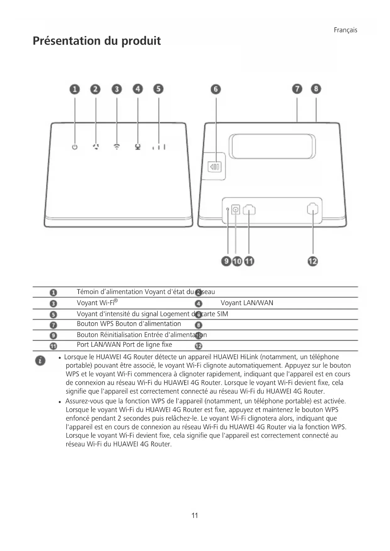 Ce produit peut être utilisé dans tous les états membres de l'UE. Veuillez vous conformer à la réglementation nationale et locale en fonction du lieu d'utilisation du produit. Ce produit peut faire l'objet d'une restriction d'utilisation en fonction du réseau local. Restrictions au niveau de la bande 2,4 GHz : Norvège : Ce sous-chapitre ne s'applique pas à la zone géographique de 20 km de rayon autour du centre de Ny-Ålesund. 21Informations produit lié à l'énergie (ErP) Huawei Technologies Co., Ltd. déclare par la présente que ses produits sont conformes à la directive sur les produits liés à l'énergie (ErP) 2009/125/EC. Pour des informations détaillées sur les produits liés à l'énergie (ErP) et les guides d'utilisation requis par le règlement de la Commission, veuillez visiter : http://consumer.huawei.com/en/certication. Bandes de fréquence et puissance a) Les bandes de fréquences sur lesquelles fonctionne l'équipement radiotéléphonique : certaines bandes ne sont pas disponibles dans tous les pays ou dans toutes les régions. Pour plus d'informations, veuillez contacter votre opérateur local. b) La puissance de radioélectrique maximale transmise sur les bandes de fréquences dans lesquelles fonctionne l'équipement radiotéléphonique : la puissance maximale pour toutes les bandes est inférieure à la valeur limite la plus élevée spéciée par la norme harmonisée. Les bandes de fréquences et les limites nominales de la puissance d'émission (rayonnée et/ou conduite) applicables à cet équipement radiotéléphonique sont les suivantes : GSM 900: 36 dBm, GSM 1800: 33 dBm, WCDMA 900/2100: 25.7 dBm, LTE Band 1/3/7/8/20/38: 25.7 dBm, Wi-Fi 2.4G: 20 dBm. Informations relatives aux accessoires et logiciels Dans certains pays et régions, des accessoires sont en option. Des accessoires en option peuvent être achetés auprès d'un fournisseur agréé, au besoin. Nous recommandons les accessoires suivants : Adaptateurs : HW-120100X01 (X représente les différents types de prises utilisées, qui peuvent être C, U, J, E, B, A, I, R, Z ou K, selon votre région) La version logicielle du produit est 10.0.1.1(H187SP2C00). Les mises à jour logicielles seront publiées par le fabricant pour corriger les bogues ou améliorer les fonctionnalités après la sortie du produit. Toutes les versions des logiciels publiées par le fabricant ont été vériées et sont toujours conformes aux règles connexes. Tous les paramètres RF (par exemple la plage de fréquence et la puissance de sortie) ne sont pas accessibles à l'utilisateur et ne peuvent pas être modiés par l'utilisateur. Pour obtenir les informations les plus récentes relatives aux accessoires et aux logiciels, veuillez consulter la Déclaration de conformité (DoC) sur http://consumer.huawei.com/certication. Visitez le site http://consumer.huawei.com/en/support/hotline pour connaître le numéro de l'assistance technique et l'adresse électronique les plus récents correspondant à votre pays ou région. 22Produktübersicht Stromanzeige Netzwerk-Statusanzeige WLAN-Anzeige LAN-/WAN-Anzeige Signalstärkeanzeige SIM-Kartensteckplatz WPS-Taste Ein-/Aus-Taste Reset-Taste Netzeingang LAN-/WAN-Anschluss Anschluss für Festnetztelefon l Wenn der HUAWEI 4G Router ein HUAWEI HiLink Gerät (z. B. ein Mobiltelefon) erkennt, das gekoppelt werden kann, blinkt die Anzeigeleuchte WLAN automatisch. Drücken Sie die Taste WPS. Die Anzeigeleuchte WLAN beginnt daraufhin, schnell zu blinken und zeigt damit an, dass das Gerät mit dem WLAN-Netzwerk des HUAWEI 4G Routers verbunden ist. Wenn die Anzeigeleuchte WLAN von Blinken auf Dauerleuchten wechselt, ist das Gerät erfolgreich mit dem WLAN-Netzwerk des HUAWEI 4G Routers verbunden. l Stellen Sie sicher, dass die WPS-Funktion des Geräts (z. B. eines Mobiltelefons) aktiviert ist. Wenn die Anzeigeleuchte WLAN des HUAWEI 4G Routers dauerhaft leuchtet, halten Sie die Taste WPS 2 Sekunden lang gedrückt und lassen Sie sie dann los. Die Anzeigeleuchte WLAN blinkt dann und zeigt damit an, dass sich das Gerät über die Funktion WPS mit dem WLAN-Netzwerk des HUAWEI 4G Routers verbindet. Wenn die Anzeigeleuchte WLAN von Blinken auf Dauerleuchten wechselt, ist das Gerät erfolgreich mit dem WLAN-Netzwerk des HUAWEI 4G Routers verbunden. Deutsch 23Erste Schritte Schritt 1: Einsetzen der SIM-Karte