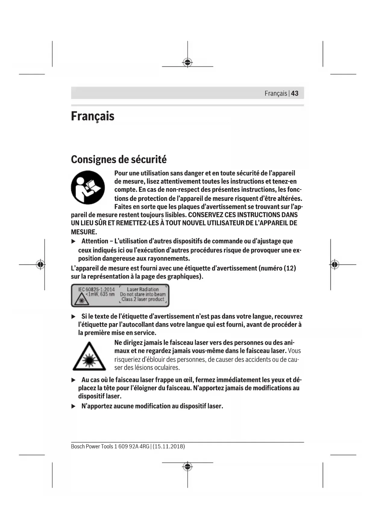 Lors de l’arrêt de l’appareil de mesure, les valeurs enregistrées et les réglages de l’appa- reil restent en mémoire.Processus de mesure Après sa mise en marche, l’appareil de mesure se trouve dans le mode Mesure de lon- gueurs. Pour sélectionner une autre fonction de mesure, appuyez sur la touche (7)[Func]. Sélectionnez dans les (voir « Fonctions de mesure », Page50) la fonction de mesure désirée à l’aide de la touche(3)[+] ou de la touche (8)[–]. Activez la fonc- tion de mesure à l’aide de la touche (7)[Func] ou de la touche de mesure (2) [ ]. À la mise en marche de l’appareil de mesure, le plan de référence pour les mesures est le bord arrière. Pour changer de plan de référence: (voir « Sélection du plan de référence (voir figureA) », Page49). Placez l’appareil de mesure au point de départ souhaité de la mesure (par ex. contre un mur). Remarque: Si l’appareil de mesure a été mis en marche avec la touche Marche/Arrêt (5) [ ], appuyez brièvement sur la touche de mesure (2) [ ] pour activer le laser. Pour déclencher la mesure, appuyez brièvement sur la touche de mesure (2) [ ]. Le faisceau laser s’éteint ensuite automatiquement. Pour effectuer une autre mesure, réité- rer cette procédure. u Ne dirigez pas le faisceau laser vers des personnes ou des animaux et ne regar- dez jamais dans le faisceau laser, même si vous êtes à grande distance de ce der- nier. Remarque:La valeur mesurée s’affiche normalement au bout de 0,5 s, au plus tard après env. 4secondes. La durée de la mesure dépend de la distance, des conditions de luminosité et des propriétés de réflexion de la surface cible. Au terme de la mesure, le faisceau laser s’éteint automatiquement. Sélection du plan de référence (voir figureA) Il est possible de sélectionner trois différents plans de référence pour les mesures : – bord arrière de l’appareil (p. ex. lorsque l’appareil est positionné contre un mur), – bord avant de l’appareil (p. ex. pour des mesures prises à partir du bord d’une table), – centre du trou taraudé (13) (p. ex. pour des mesures sur trépied) Pour choisir le plan de référence, appuyez sur la touche (4). Sélectionnez le plan de réfé- rence souhaité avec la touche (3) [+], la touche (8) [–] ou la touche (4). À chaque mise en marche de l’appareil de mesure, le plan de référence pour les mesures est le bord ar- rière. Menu « Réglages de base » Pour parvenir au menu « Réglages de base » (h), appuyez de façon prolongée sur la touche (7) [Func]. Français | 49 Bosch Power Tools 1 609 92A 4RG | (15.11.2018)50 | Français 1 609 92A 4RG | (15.11.2018) Bosch Power Tools Sélectionnez le réglage de base voulu et modifiez-le. Pour quitter le menu « Réglages de base », appuyez sur la touche Marche/Arrêt (5) [ ]. Éclairage de l’écran L’écran est éclairé en permanence. 20 s après le dernier actionnement d’une touche, la luminosité de l’écran diminue pour économiser les piles. Fonctions de mesure Mesure de longueurs Sélectionnez la mesure de longueurs . Pour activer le faisceau laser, appuyez brièvement sur la touche de mesure (2) [ ]. Pour déclencher la mesure, appuyez brièvement sur la touche de mesure (2) [ ]. La va- leur de mesure s’affiche au bas de l’écran.