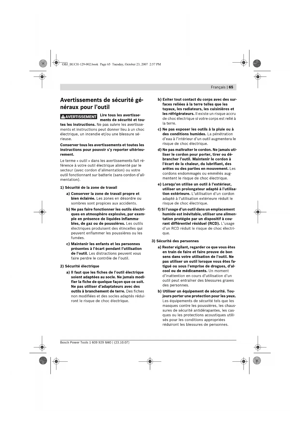 a) Rester vigilant, regarder ce que vous êtes en train de faire et faire preuve de bon sens dans votre utilisation de l’outil. Ne pas utiliser un outil lorsque vous êtes fa- tigué ou sous l’emprise de drogues, d’al- cool ou de médicaments. Un moment d’inattention en cours d’utilisation d’un outil peut entraîner des blessures graves des personnes. b) Utiliser un équipement de sécurité. Tou- jours porter une protection pour les yeux. Les équipements de sécurité tels que les masques contre les poussières, les chaus- sures de sécurité antidérapantes, les cas- ques ou les protections acoustiques utili- sés pour les conditions appropriées réduiront les blessures de personnes. AVERTISSEMENT OBJ_BUCH-129-002.book Page 65 Tuesday, October 23, 2007 2:57 PM1 609 929 M40 | (23.10.07) Bosch Power Tools 66 | Français c) Eviter tout démarrage intempestif. S’as- surer que l’interrupteur est en position arrêt avant de brancher l’outil au secteur et/ou au bloc de batteries, de le ramasser ou de le porter. Porter les outils en ayant le doigt sur l’interrupteur ou brancher des outils dont l’interrupteur est en position marche est source d’accidents. d) Retirer toute clé de réglage avant de met- tre l’outil en marche. Une clé laissée fixée sur une partie tournante de l’outil peut donner lieu à des blessures de personnes. e) Ne pas se précipiter. Garder une position et un équilibre adaptés à tout moment. Cela permet un meilleur contrôle de l’outil dans des situations inattendues. f) S’habiller de manière adaptée. Ne pas porter de vêtements amples ou de bijoux. Garder les cheveux, les vêtements et les gants à distance des parties en mouve- ment. Des vêtements amples, des bijoux ou les cheveux longs peuvent être pris dans des parties en mouvement. g) Si des dispositifs sont fournis pour le rac- cordement d’équipements pour l’extrac- tion et la récupération des poussières, s’assurer qu’ils sont connectés et correc- tement utilisés. Utiliser des collecteurs de poussière peut réduire les risques dus aux poussières.