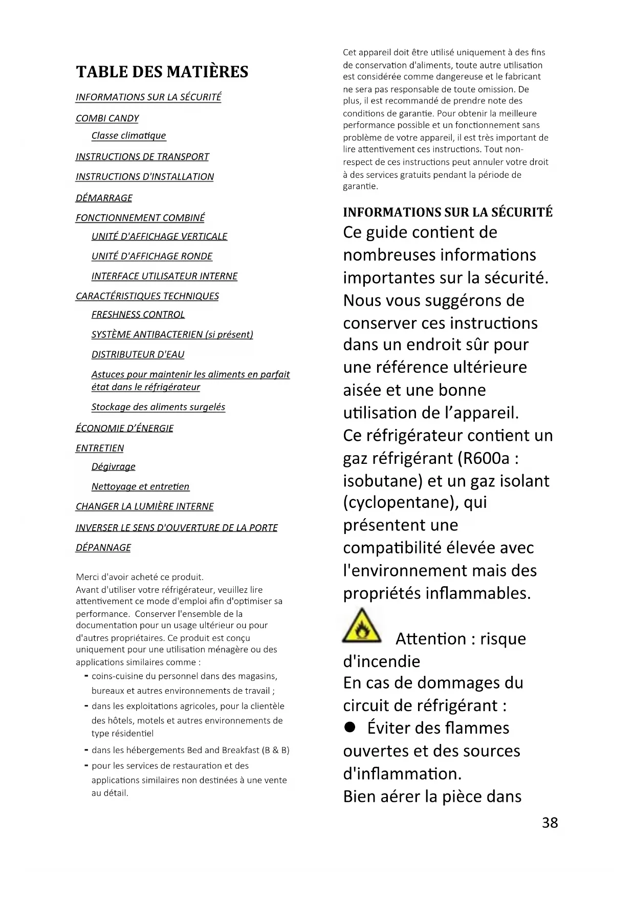 INFORMATIONS SUR LA SÉCURITÉ COMBI CANDY Classe climatique INSTRUCTIONS DE TRANSPORT INSTRUCTIONS D'INSTALLATION DÉMARRAGE FONCTIONNEMENT COMBINÉ UNITÉ D'AFFICHAGE VERTICALE UNITÉ D'AFFICHAGE RONDE INTERFACE UTILISATEUR INTERNE CARACTÉRISTIQUES TECHNIQUES FRESHNESS CONTROL SYSTÈME ANTIBACTERIEN (si présent) DISTRIBUTEUR D'EAU Astuces pour maintenir les aliments en parfait état dans le réfrigérateur Stockage des aliments surgelés ÉCONOMIE D’ÉNERGIE ENTRETIEN Dégivrage Nettoyage et entretien CHANGER LA LUMIÈRE INTERNE INVERSER LE SENS D'OUVERTURE DE LA PORTE DÉPANNAGE Merci d'avoir acheté ce produit. Avant d'utiliser votre réfrigérateur, veuillez lire attentivement ce mode d'emploi afin d'optimiser sa performance. Conserver l'ensemble de la documentation pour un usage ultérieur ou pour d'autres propriétaires. Ce produit est conçu uniquement pour une utilisation ménagère ou des applications similaires comme : - coins-cuisine du personnel dans des magasins, bureaux et autres environnements de travail ; - dans les exploitations agricoles, pour la clientèle des hôtels, motels et autres environnements de type résidentiel - dans les hébergements Bed and Breakfast (B & B) - pour les services de restauration et des applications similaires non destinées à une vente au détail. Cet appareil doit être utilisé uniquement à des fins de conservation d'aliments, toute autre utilisation est considérée comme dangereuse et le fabricant ne sera pas responsable de toute omission. De plus, il est recommandé de prendre note des conditions de garantie. Pour obtenir la meilleure performance possible et un fonctionnement sans problème de votre appareil, il est très important de lire attentivement ces instructions. Tout non-respect de ces instructions peut annuler votre droit à des services gratuits pendant la période de garantie.