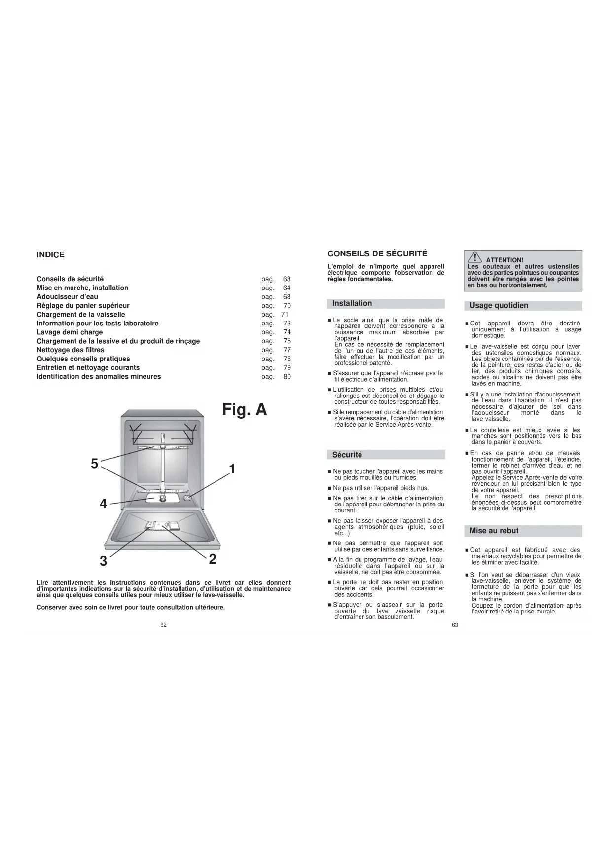 L'emploi de n'importe quel appareilélectrique comporte l'observation derègles fondamentales. Installation ■ Le socle ainsi que la prise mâle del'appareil doivent correspondre à lapuissance maximum absorbée parl'appareil.En cas de nécessité de remplacementde l'un ou de l'autre de ces éléments,faire effectuer la modification par unprofessionel patenté.■ S'assurer que l'appareil n'écrase pas lefil électrique d'alimentation.■ L'utilisation de prises multiples et/ourallonges est déconseillée et dégage leconstructeur de toutes responsabilités.■ Si le remplacement du câble d'alimentations'avère nécessaire, l'opération doit êtreréalisée par le Service Après-vente. Sécurité ■ Ne pas toucher l'appareil avec les mainsou pieds mouillés ou humides. ■ Ne pas utiliser l'appareil pieds nus.■ Ne pas tirer sur le câble d'alimentationde l'appareil pour débrancher la prise ducourant.■ Ne pas laisser exposer l'appareil à desagents atmosphériques (pluie, soleiletc...).■ Ne pas permettre que l'appareil soitutilisé par des enfants sans surveillance.■ A la fin du programme de lavage, l’eaurésiduelle dans l’appareil ou sur lavaisselle, ne doit pas être consommée.■ La porte ne doit pas rester en positionouverte car cela pourrait occasionnerdes accidents.■ S’appuyer ou s’asseoir sur la porteouverte du lave vaisselle risqued’entraîner son basculement.ATTENTION!Les couteaux et autres ustensilesavec des parties pointues ou coupantesdoivent être rangés avec les pointesen bas ou horizontalement. Usage quotidien ■ Cet appareil devra être destinéuniquement à l'utilisation à usagedomestique.■ Le lave-vaisselle est conçu pour laverdes ustensiles domestiques normaux.Les objets contaminés par de l'essence,de la peinture, des restes d'acier ou defer, des produits chimiques corrosifs,acides ou alcalins ne doivent pas êtrelavés en machine.■ S'il y a une installation d'adoucissementde l'eau dans l'habitation, il n'est pasnécessaire d'ajouter de sel dansl'adoucisseur monté dans lelave-vaisselle.■ La coutellerie est mieux lavée si lesmanches sont positionnés vers le basdans le panier à couverts.■ En cas de panne et/ou de mauvaisfonctionnement de l'appareil, l'éteindre,fermer le robinet d'arrivée d'eau et nepas ouvrir l'appareil.Appelez le Service Après-vente de votrerevendeur en lui précisant bien le typede votre appareil.Le non respect des prescriptionsénoncées ci-dessus peut compromettrela sécurité de l'appareil. Mise au rebut ■ Cet appareil est fabriqué avec desmatériaux recyclables pour permettre deles éliminer avec facilité.■ Si l'on veut se débarrasser d'un vieuxlave-vaisselle, enlever le système defermeture de la porte pour que lesenfants ne puissent pas s'enfermer dansla machine.Coupez le cordon d’alimentation aprèsl’avoir retiré de la prise murale. pag. 63 pag. 64 pag. 68 pag. 70 pag. 71 pag. 73 pag. 74 pag. 75 pag. 77 pag. 78 pag. 79 pag. 8064 INSTALLATION (Remarques techniques) ■ Après le déballage, régler la hauteur du lave-vaisselle. Pour un fonctionnement parfait, il est important que le lave-vaisselle soit à niveau, en règlant les pieds de façon à ce qu'une éventuelle inclinaison ne dépasse pas 2 degrés. ■ Dans le cas où vous devez transporter de façon manuelle la machine sans emballage, ne pas prendre la porte par le bas, mais faire comme dans le schéma; ouvrir légèrement la porte et soulever l'appareil en utilisant le top supérieur. IMPORTANT Les ouvertures à la base de l'appareil ne doivent en aucun cas être obstruées par des tapis, moquette ou autre objets. À l'installation il est important de verifier que la prise soit facilement accessible. Alimentation Electrique L'appareil est conforme aux exigences de sécurité prévues par les différents instituts de Normes, et c'est la prise tripolaire avec un pôle de terre qui assure la mise à la terre complète de l'appareil. Avant de brancher la machine sur le circuit électrique s'assurer: