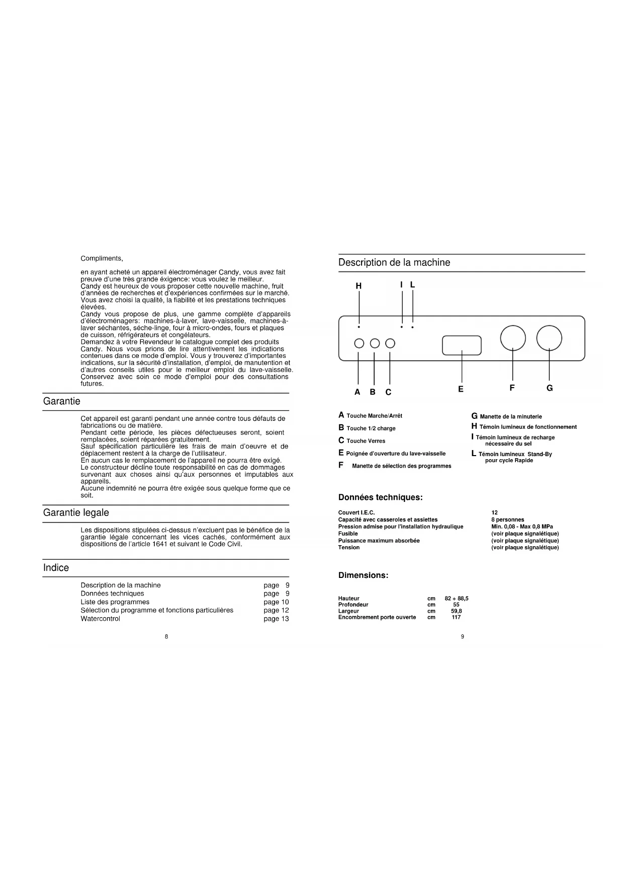Compliments, en ayant acheté un appareil électroménager Candy, vous avez fait preuve d’une très grande éxigence: vous voulez le meilleur. Candy est heureux de vous proposer cette nouvelle machine, fruit d’années de recherches et d’expériences confirmées sur le marché. Vous avez choisi la qualité, la fiabilité et les prestations techniques élevées. Candy vous propose de plus, une gamme complète d’appareils d’électroménagers: machines-à-laver, lave-vaisselle, machines-à- laver séchantes, séche-linge, four à micro-ondes, fours et plaques de cuisson, réfrigérateurs et congélateurs. Demandez à votre Revendeur le catalogue complet des produits Candy. Nous vous prions de lire attentivement les indications contenues dans ce mode d’emploi. Vous y trouverez d’importantes indications, sur la sécurité d’installation, d’emploi, de manutention et d’autres conseils utiles pour le meilleur emploi du lave-vaisselle. Conservez avec soin ce mode d’emploi pour des consultations futures. Cet appareil est garanti pendant une année contre tous défauts de fabrications ou de matière. Pendant cette période, les pièces défectueuses seront, soient remplacées, soient réparées gratuitement. Sauf spécification particulière les frais de main d’oeuvre et de déplacement restent à la charge de l’utilisateur. En aucun cas le remplacement de l’appareil ne pourra être exigé. Le constructeur décline toute responsabilité en cas de dommages survenant aux choses ainsi qu’aux personnes et imputables aux appareils. Aucune indemnité ne pourra être exigée sous quelque forme que ce soit. Les dispositions stipulées ci-dessus n’excluent pas le bénéfice de la garantie légale concernant les vices cachés, conformément aux dispositions de l’article 1641 et suivant le Code Civil. Description de la machine Données techniques Liste des programmes Sélection du programme et fonctions particulières Watercontrol page 9 page 9 page 10 page 12 page 13 Garantie Garantie legale Indice Description de la machine