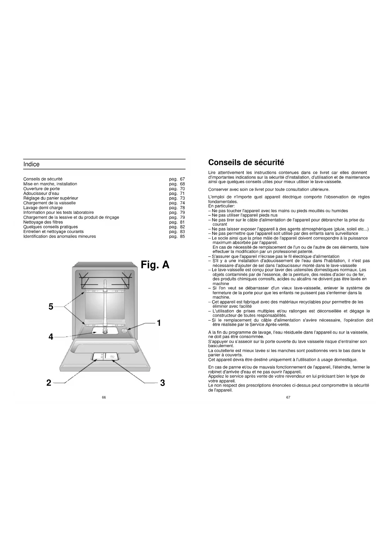 Indice Conseils de sécurité Mise en marche, installation Ouverture de porte Adoucisseur d’eau Réglage du panier supérieur Chargement de la vaisselle Lavage demi charge Information pour les tests laboratoire Chargement de la lessive et du produit de rinçage Nettoyage des filtres Quelques conseils pratiques Entretien et nettoyage courants Identification des anomalies mineures pag. 67 pag. 68 pag. 70 pag. 71 pag. 73 pag. 74 pag. 78 pag. 79 pag. 79 pag. 81 pag. 82 pag. 83 pag. 85