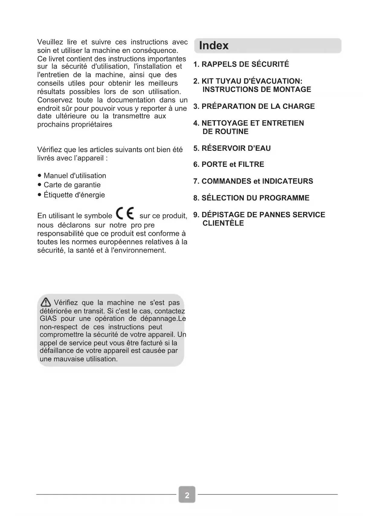 Index Veuillez lire et suivre ces instructions avec soin et utiliser la machine en conséquence. Ce livret contient des instructions importantes sur la sécurité d'utilisation, l'installation et l'entretien de la machine, ainsi que des conseils utiles pour obtenir les meilleurs résultats possibles lors de son utilisation. Conservez toute la documentation dans un endroit sûr pour pouvoir vous y reporter à une date ultérieure ou la transmettre aux prochains propriétairesVérifiez que les articles suivants ont bien été livrés avec l’appareil :● Manuel d'utilisation● Carte de garantie● Étiquette d'énergie En utilisant le symbole sur ce produit, nous déclarons sur notre pro pre responsabilité que ce produit est conforme à toutes les normes européennes relatives à la sécurité, la santé et à l'environnement. Vérifiez que la machine ne s'est pas détériorée en transit. Si c'est le cas, contactez GIAS pour une opération de dépannage.Le non-respect de ces instructions peut compromettre la sécurité de votre appareil. Un appel de service peut vous être facturé si la défaillance de votre appareil est causée par une mauvaise utilisation.1. RAPPELS DE SÉCURITÉ2. KIT TUYAU D'ÉVACUATION:INSTRUCTIONS DE MONTAGE3. PRÉPARATION DE LA CHARGE4. NETTOYAGE ET ENTRETIENDE ROUTINE 5. RÉSERVOIR D’EAU6. PORTE et FILTRE7. COMMANDES et INDICATEURS8. SÉLECTION DU PROGRAMME9. DÉPISTAGE DE PANNES SERVICE CLIENTÈLE1.