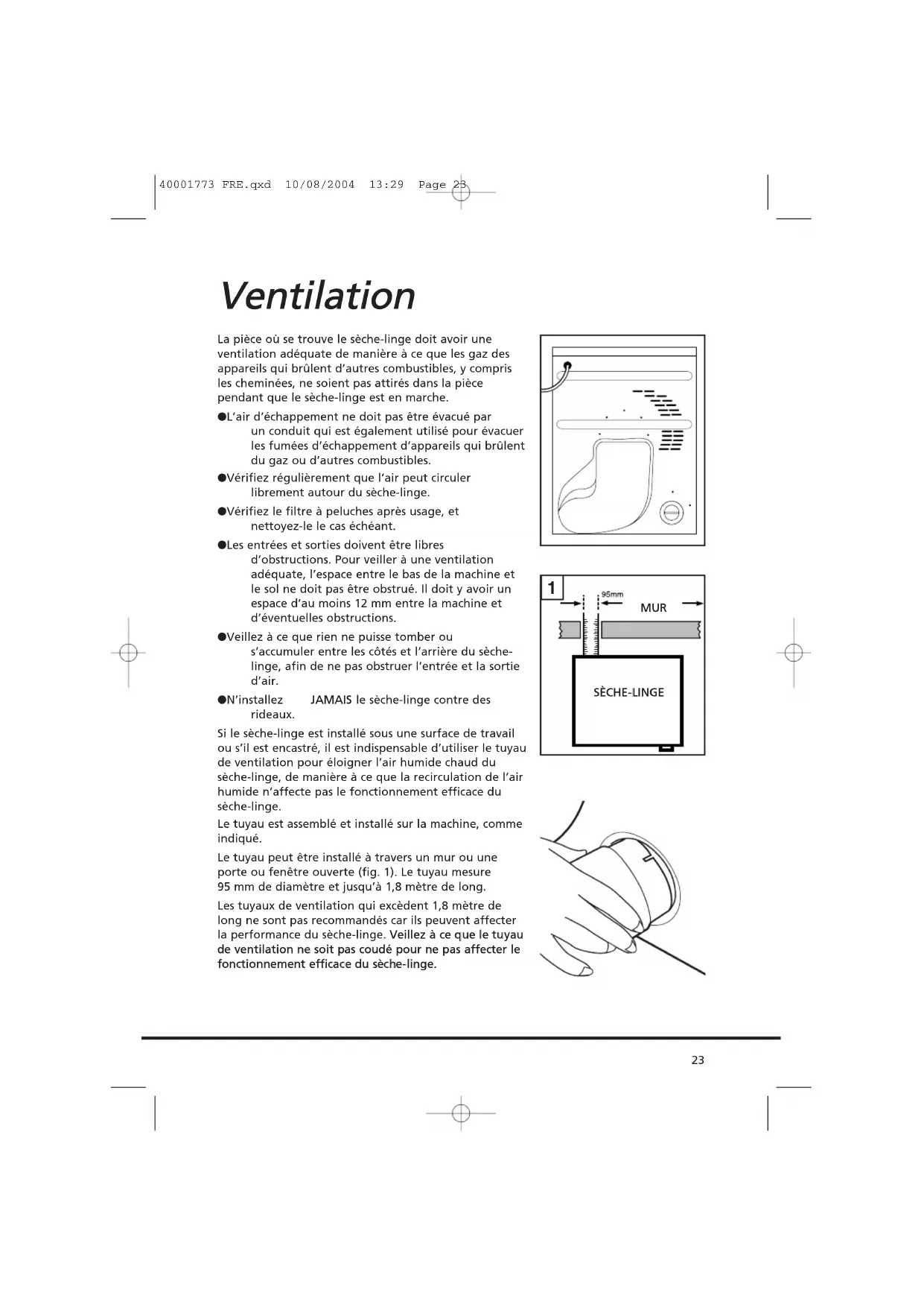 IInnssttaallllaattiioonn UUnn aappppeell ddee sseerrvviiccee ppeeuutt vvoouuss êêttrree ffaaccttuurréé ssii llaa ddééffaaiillllaannccee ddee vvoottrree aappppaarreeiill eesstt ccaauussééee ppaarr uunnee iinnssttaallllaattiioonn iinnccoorrrreeccttee.. SSii llee ccoorrddoonn éélleeccttrriiqquuee ddee cceett aappppaarreeiill eesstt eennddoommmmaaggéé,, iill ddooiitt êêttrree rreemmppllaaccéé ppaarr uunn ccoorrddoonn ssppéécciiaall qquuii eesstt UUNNIIQQUUEEMMEENNTT ddiissppoonniibbllee aauupprrèèss dduu sseerrvviiccee ddeess ppiièècceess ddee rreecchhaannggee.. IIll ddooiitt êêttrree iinnssttaalllléé ppaarr uunnee ppeerrssoonnnnee ccoommppéétteennttee.. NNee bbrraanncchheezz ppaass ll’’aappppaarreeiill eett nnee mmeetttteezz ppaass eenn mmaarrcchhee ll’’iinntteerrrruupptteeuurr ddee sseecctteeuurr ttaanntt qquuee ll’’iinnssttaallllaattiioonn nn’’eesstt ppaass tteerrmmiinnééee.. PPaarr mmeessuurree ddee ssééccuurriittéé,, vveeiilllleezz àà iinnssttaalllleerr ccee ssèècchhee--lliinnggee ccoorrrreecctteemmeenntt.. EEnn ccaass ddee ddoouuttee ccoonncceerrnnaanntt ssoonn iinnssttaallllaattiioonn,, vveeuuiilllleezz ddeemmaannddeerr ccoonnsseeiill àà GGIIAASS SSeerrvviiccee.. 40001773 FRE.qxd 10/08/2004 13:29 Page 22La pièce où se trouve le sèche-linge doit avoir une ventilation adéquate de manière à ce que les gaz des appareils qui brûlent d’autres combustibles, y compris les cheminées, ne soient pas attirés dans la pièce pendant que le sèche-linge est en marche. ● L’air d’échappement ne doit pas être évacué par un conduit qui est également utilisé pour évacuer les fumées d’échappement d’appareils qui brûlent du gaz ou d’autres combustibles. ● Vérifiez régulièrement que l’air peut circuler librement autour du sèche-linge. ● Vérifiez le filtre à peluches après usage, et nettoyez-le le cas échéant. ● Les entrées et sorties doivent être libres d’obstructions. Pour veiller à une ventilation adéquate, l’espace entre le bas de la machine et le sol ne doit pas être obstrué. Il doit y avoir un espace d’au moins 12 mm entre la machine et d’éventuelles obstructions. ● Veillez à ce que rien ne puisse tomber ou s’accumuler entre les côtés et l’arrière du sèche- linge, afin de ne pas obstruer l’entrée et la sortie d’air. ● N’installez JJAAMMAAIISS le sèche-linge contre des rideaux. Si le sèche-linge est installé sous une surface de travail ou s’il est encastré, il est indispensable d’utiliser le tuyau de ventilation pour éloigner l’air humide chaud du sèche-linge, de manière à ce que la recirculation de l’air humide n’affecte pas le fonctionnement efficace du sèche-linge. Le tuyau est assemblé et installé sur la machine, comme indiqué. Le tuyau peut être installé à travers un mur ou une porte ou fenêtre ouverte (fig. 1). Le tuyau mesure 95 mm de diamètre et jusqu’à 1,8 mètre de long. Les tuyaux de ventilation qui excèdent 1,8 mètre de long ne sont pas recommandés car ils peuvent affecter la performance du sèche-linge. VVeeiilllleezz àà ccee qquuee llee ttuuyyaauu ddee vveennttiillaattiioonn nnee ssooiitt ppaass ccoouuddéé ppoouurr nnee ppaass aaffffeecctteerr llee ffoonnccttiioonnnneemmeenntt eeffffiiccaaccee dduu ssèècchhee--lliinnggee..