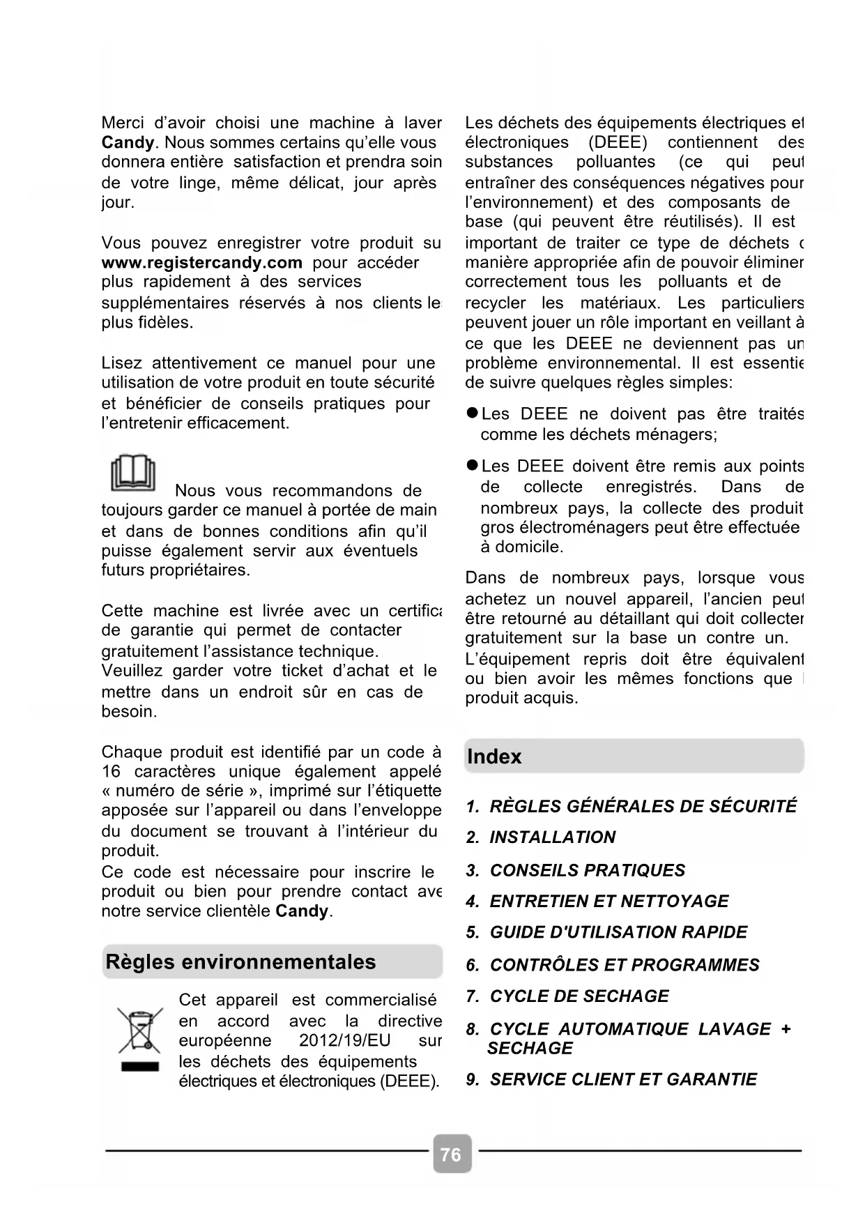Merci d’avoir choisi une machine à laver Candy. Nous sommes certains qu’elle vous donnera entière satisfaction et prendra soin de votre linge, même délicat, jour après jour. Vous pouvez enregistrer votre produit sur www.registercandy.com pour accéder plus rapidement à des services supplémentaires réservés à nos clients les plus fidèles. Lisez attentivement ce manuel pour une utilisation de votre produit en toute sécurité et bénéficier de conseils pratiques pour l’entretenir efficacement. Nous vous recommandons de toujours garder ce manuel à portée de main et dans de bonnes conditions afin qu’il puisse également servir aux éventuels futurs propriétaires. Cette machine est livrée avec un certificat de garantie qui permet de contacter gratuitement l’assistance technique. Veuillez garder votre ticket d’achat et le mettre dans un endroit sûr en cas de besoin. Chaque produit est identifié par un code à 16 caractères unique également appelé « numéro de série », imprimé sur l’étiquette apposée sur l’appareil ou dans l’enveloppe du document se trouvant à l’intérieur du produit. Ce code est nécessaire pour inscrire le produit ou bien pour prendre contact avec notre service clientèle Candy.