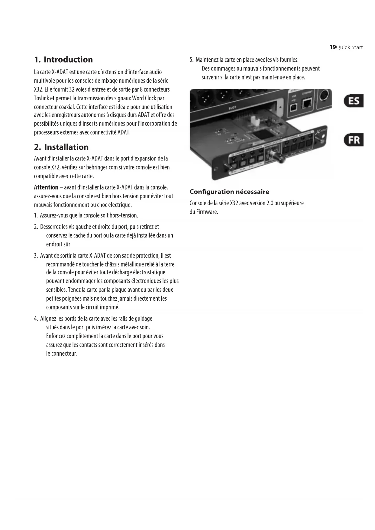 Desdommages ou mauvais fonctionnements peuvent survenir si la carte n’est pas maintenue en place. Conguration nécessaire Console de la série X32 avec version 2.0 ou supérieure duFirmware.20 DIGITAL MIXER OPTION X-ADAT