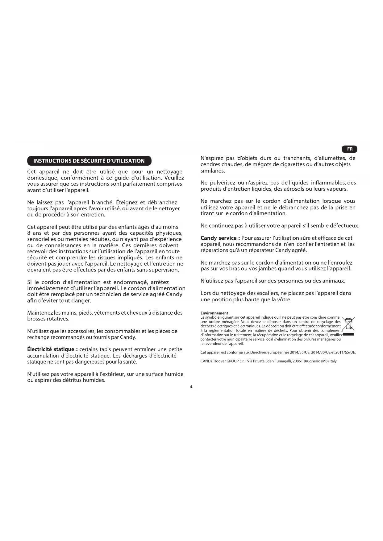 Cet appareil ne doit être utilisé que pour un nettoyage domestique, conformément à ce guide d’utilisation. Veuillez vous assurer que ces instructions sont parfaitement comprises avant d’utiliser l’appareil. Ne laissez pas l’appareil branché. Éteignez et débranchez toujours l’appareil après l’avoir utilisé, ou avant de le nettoyer ou de procéder à son entretien. Cet appareil peut être utilisé par des enfants âgés d’au moins 8 ans et par des personnes ayant des capacités physiques, sensorielles ou mentales réduites, ou n’ayant pas d’expérience ou de connaissances en la matière. Ces dernières doivent recevoir des instructions sur l’utilisation de l’appareil en toute sécurité et comprendre les risques impliqués. Les enfants ne doivent pas jouer avec l’appareil. Le nettoyage et l’entretien ne devraient pas être eectués par des enfants sans supervision. Si le cordon d’alimentation est endommagé, arrêtez immédiatement d’utiliser l’appareil. Le cordon d’alimentation doit être remplacé par un technicien de service agréé Candy an d’éviter tout danger. Maintenez les mains, pieds, vêtements et cheveux à distance des brosses rotatives. N’utilisez que les accessoires, les consommables et les pièces de rechange recommandés ou fournis par Candy. Électricité statique : certains tapis peuvent entraîner une petite accumulation d’électricité statique. Les décharges d’électricité statique ne sont pas dangereuses pour la santé. N’utilisez pas votre appareil à l’extérieur, sur une surface humide ou aspirer des détritus humides. N’aspirez pas d’objets durs ou tranchants, d’allumettes, de cendres chaudes, de mégots de cigarettes ou d’autres objets similaires. Ne pulvérisez ou n’aspirez pas de liquides inammables, des produits d’entretien liquides, des aérosols ou leurs vapeurs. Ne marchez pas sur le cordon d’alimentation lorsque vous utilisez votre appareil et ne le débranchez pas de la prise en tirant sur le cordon d’alimentation. Ne continuez pas à utiliser votre appareil s’il semble défectueux. Candy service : Pour assurer l’utilisation sûre et ecace de cet appareil, nous recommandons de n’en coner l’entretien et les réparations qu’à un réparateur Candy agréé. Ne marchez pas sur le cordon d’alimentation ou ne l’enroulez pas sur vos bras ou vos jambes quand vous utilisez l’appareil. N’utilisez pas l’appareil sur des personnes ou des animaux. Lors du nettoyage des escaliers, ne placez pas l’appareil dans une position plus haute que la vôtre. Environnement Le symbole gurant sur cet appareil indique qu’il ne peut pas être considéré comme une ordure ménagère. Vous devez le déposer dans un centre de recyclage des déchets électriques et électroniques. La déposition doit être eectuée conformément à la réglementation locale en matière de déchets. Pour obtenir des compléments d’information sur le traitement, la récupération et le recyclage de cet appareil, veuillez contacter votre municipalité, le service local d’élimination des ordures ménagères ou le revendeur de l’appareil. Cet appareil est conforme aux Directives européennes 2014/35/UE, 2014/30/UE et 2011/65/UE. CANDY Hoover GROUP S.r.l. Via Privata Eden Fumagalli, 20861 Brugherio (MB) Italy5