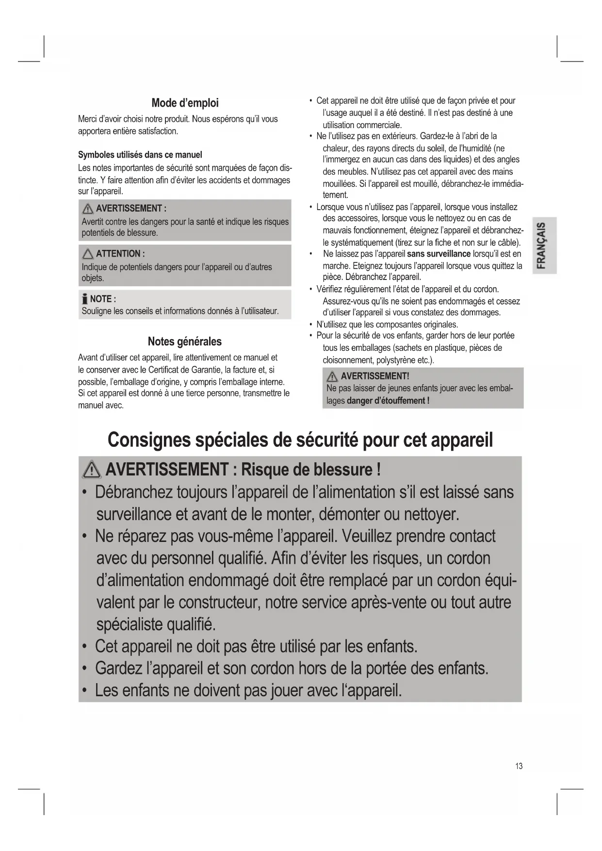 - De bladen van het mes zijn zeer scherp. Er bestaat een risico op letsel! Hanteer het mes met uiterste voorzichtigheid!13 Mode d’emploi Merci d’avoir choisi notre produit. Nous espérons qu’il vous apportera entière satisfaction. Symboles utilisés dans ce manuel Les notes importantes de sécurité sont marquées de façon dis- tincte. Y faire attention an d’éviter les accidents et dommages sur l’appareil.