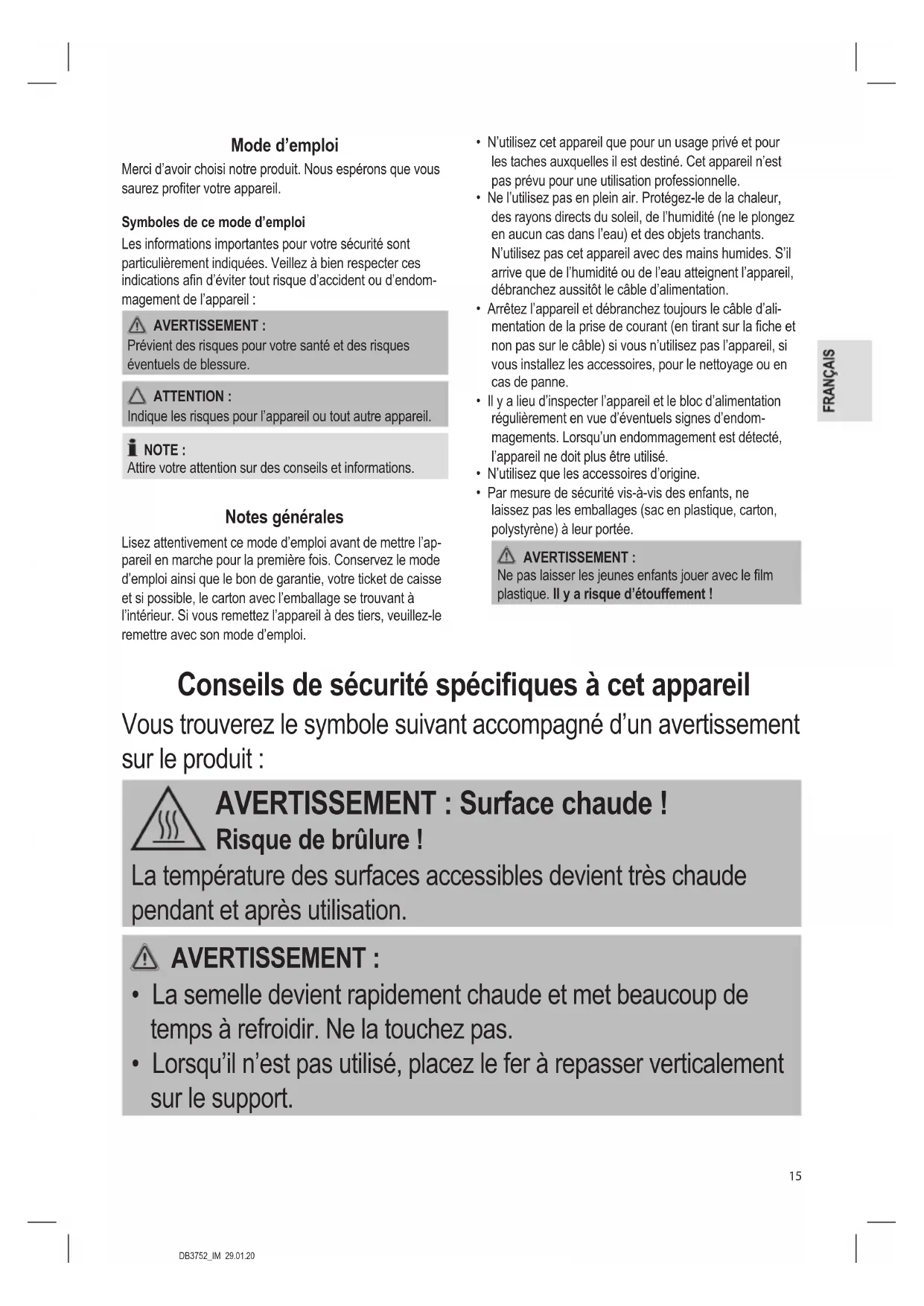 - Nettoyez la semelle et la surface de rangement avec un torchon légèrement humide. Données techniques Modèle : ....................................................................DB 3752 Alimentation : .....................................220 - 240 V~, 50 - 60 Hz Consommation : ............................................... 1800 - 2200 W Classe de protection : ............................................................ Poids net : ..............................................................env. 0,9 kg Nous nous réservons le droit d’apporter des modications techniques ainsi que des modications de conception dans le cadre du développement continu de nos produits. Cet appareil est conforme à toutes les directives CE en vigueur, telles que les directives sur la compatibilité électro- magnétique et les faibles tensions et a été fabriqué selon les derniers règlements de sécurité. Élimination Signication du symbole « Poubelle » Protégez votre environnement, ne jetez pas vos appareils électriques avec les ordures ménagères. Utilisez, pour l’élimination de vos appareils électriques, les bornes de collecte prévues à cet effet où vous pouvez vous débarrasser des appareils que vous n’utilisez plus. Vous contribuez ainsi à éviter les impacts potentiels dans l’environnement et sur la santé de chacun, causés par une mauvaise élimination de ces déchets. Vous contribuez aussi au recyclage sous toutes ses formes des appareils électriques et électroniques usagés. Vous trouverez toutes les informations sur les bornes d’élimination des appareils auprès de votre commune ou de l’administration de votre communauté.DB3752_IM 29.01.20