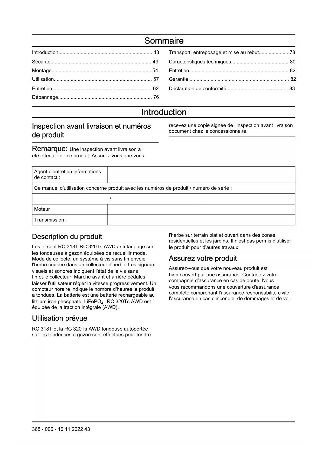 RC 320Ts AWD est équipée de la traction intégrale (AWD). Utilisation prévue RC 318T et la RC 320Ts AWD tondeuse autoportée sur les tondeuses à gazon sont effectués pour tondre l'herbe sur terrain plat et ouvert dans des zones résidentielles et les jardins. Il n'est pas permis d'utiliser le produit pour d'autres travaux. Assurez votre produit Assurez-vous que votre nouveau produit est bien couvert par une assurance. Contactez votre compagnie d'assurance en cas de doute. Nous vous recommandons une couverture d'assurance complète comprenant l'assurance responsabilité civile, l'assurance en cas d'incendie, de dommages et de vol.