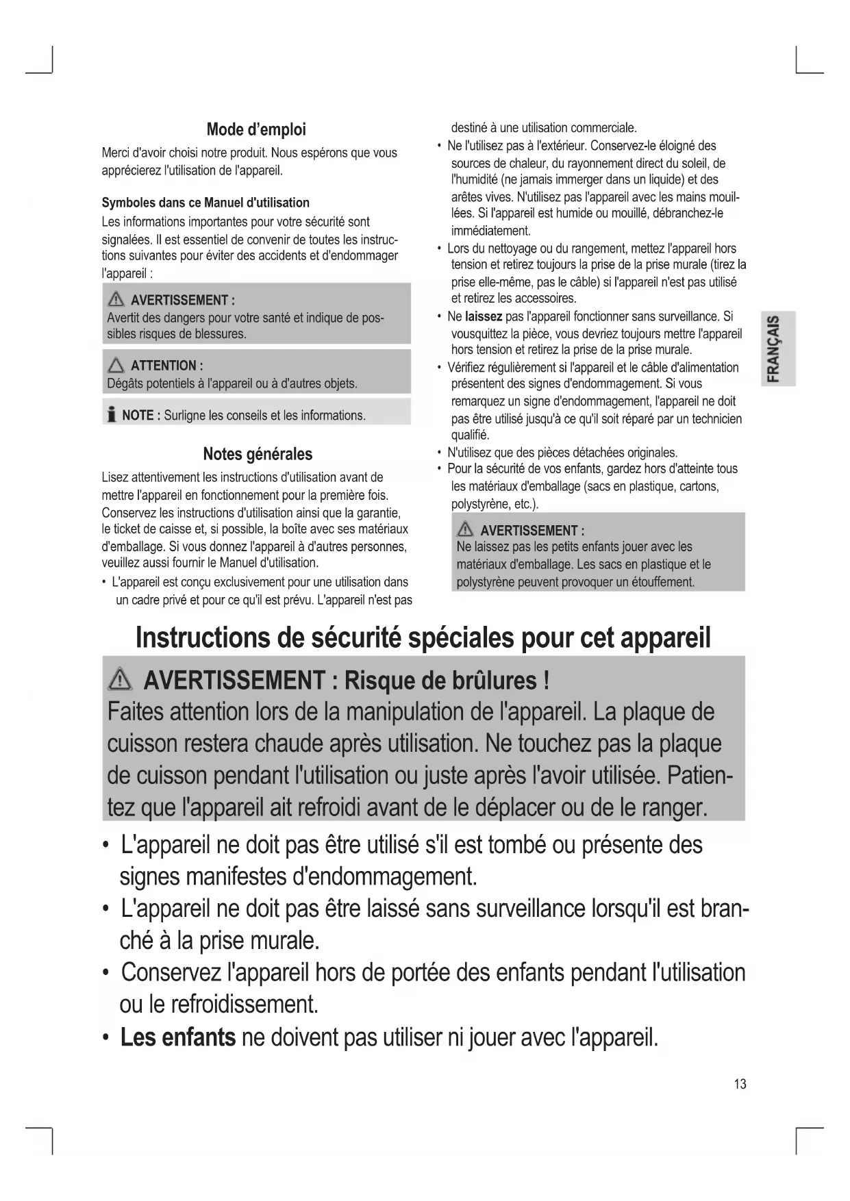 Faites attention lors de la manipulation de l'appareil. La plaque de cuisson restera chaude après utilisation. Ne touchez pas la plaque de cuisson pendant l'utilisation ou juste après l'avoir utilisée. Patien- tez que l'appareil ait refroidi avant de le déplacer ou de le ranger.